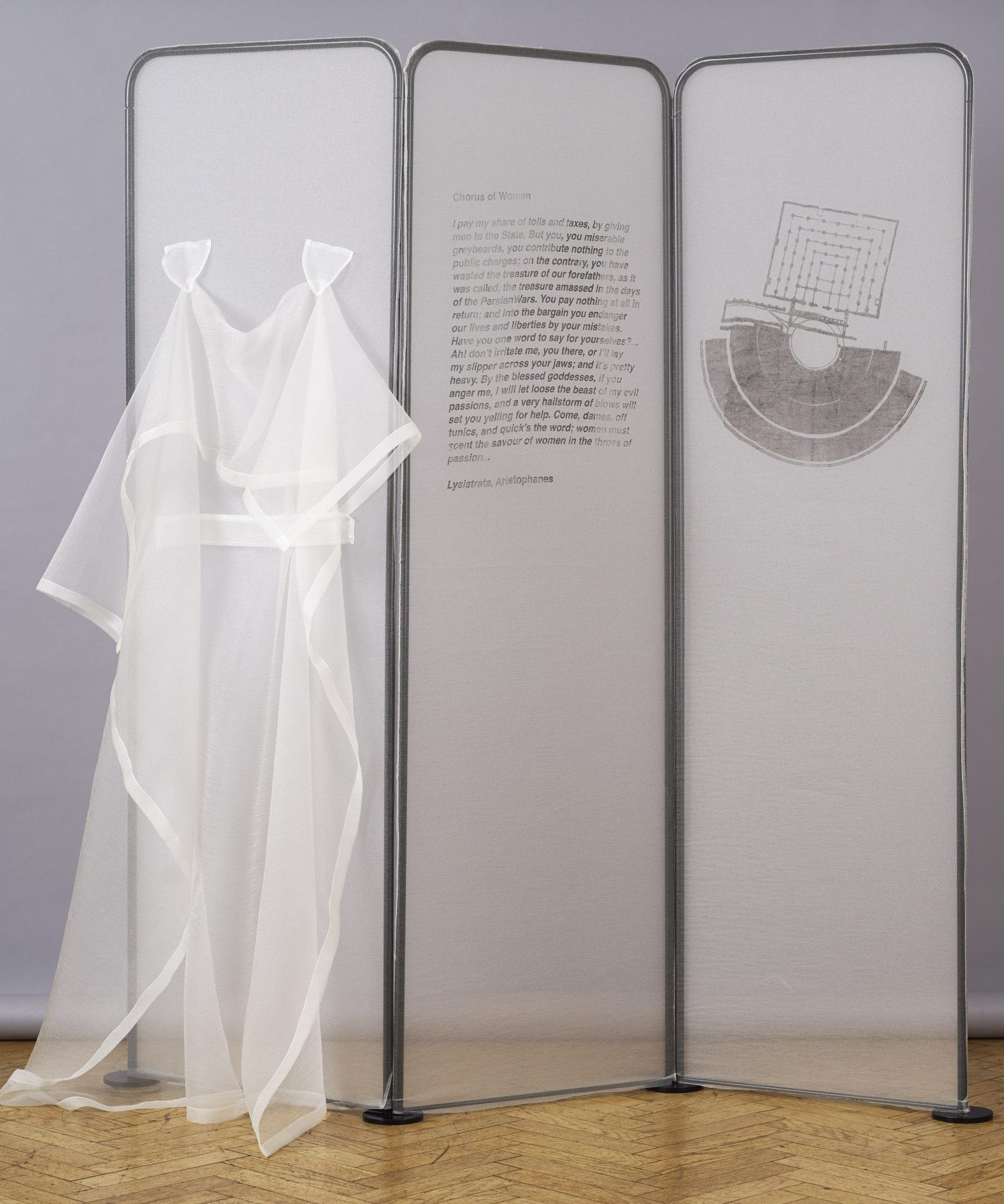 Hysteria comes from the Greek word for womb, hystera. Hysteria, a condition associated throughout history with the emotionally excessive behavior of women is a theme explored in this work. It features female characters from various kinds of literature of different genres, cultures, and ages, from Aristophanes’s comedy Lysistrata to Octavia E. Butler’s science fiction novel Wildseed to Anne Sexton’s poem about suicide. The characters make themselves present as constellations of triptych-shaped structures which resemble dressing screens. Each structure includes an allusion to the character—a quote from her speech, a piece of clothing, and an architectural reference to the space the character inhabits at the moment referred to by the quote. The quotes are angry. The work points out how these protagonists, namely in the manner in which they were presented in cultural artifacts throughout history, have contributed to, mirrored, or problematized the ways in which societies have treated women’s expressions of dissatisfaction and otherwise disciplined the behavior of women deemed inappropriate. Playing with the unstable boundaries between public and private, reality and fiction, the installation of dressing screens, costumes, architectural plans, and literary quotes poses questions regarding hysteria’s link to systemic issues of injustice.