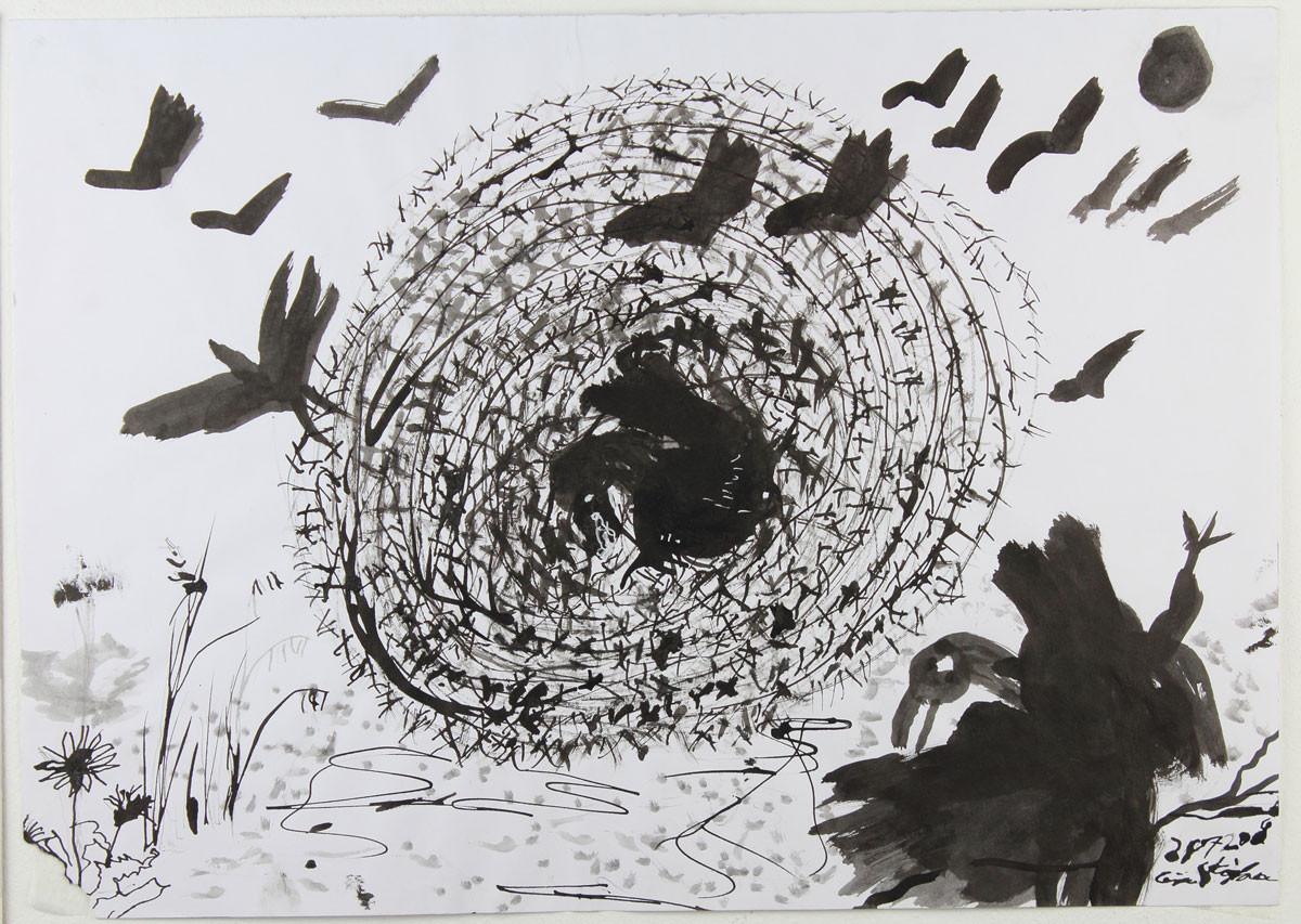 Ceija Stojka was deported to Auschwitz with her family when she was ten years old. Stojka survived Auschwitz as well as the Ravensbrück and Bergen Belsen concentration camps. In Austria in the 1980s, together with her brother Karl, she was the first to break the silence surrounding the Romani Holocaust. She made work about her fate and the fate of her family and also spoke and wrote about it. At the end of the 1980s, when Stojka was in her fifties, she started to draw and paint as an autodidact. Her work is an impressive artistic narrative about the persecution and genocide of the Roma and Sinti under National Socialism. For the exhibition, we chose works that deal with the trauma of genocide in an oblique, indirect manner, posing the question of how to translate trauma into aesthetics. The images of disembodied eyes, animals, and idyllic landscapes strike one as if something has remained unrepresented and left unsaid. The exhibited paintings resonate with the notion of what is unspeakable: what it means to be exposed to the violence and cruelty of war and genocide.