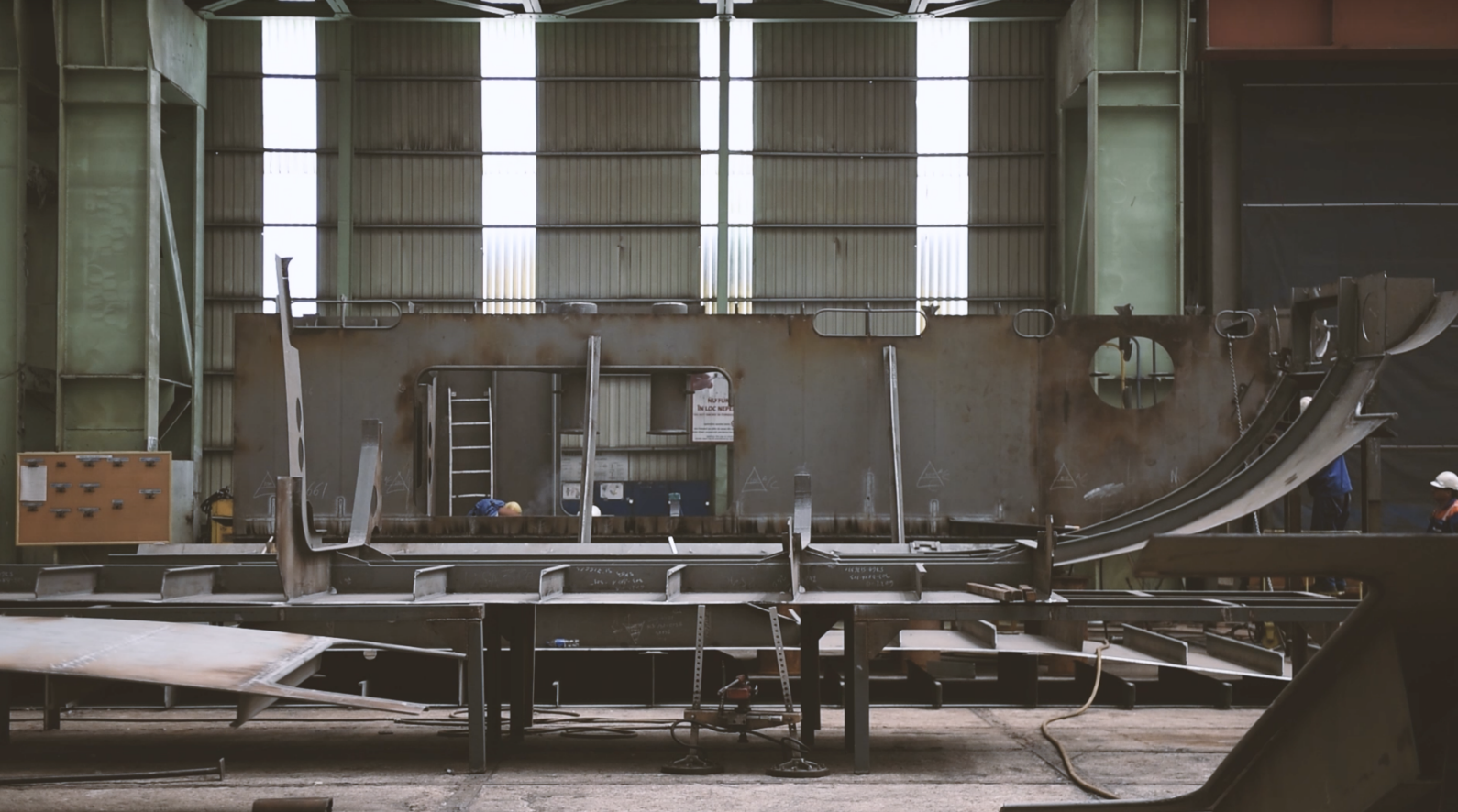 Anca Benera and Arnold Estefán are artists who have been working together since 2011. Their work in installation, video, and performance uses research-based methodologies to reveal the invisible patterns that lie behind historical, social, or geopolitical narratives. Their recent work investigates the phenomenon of man-made landscapes around the world, where the making and marking of the landscape goes hand in hand with a heightened state of violence and the overexploitation of resources. The artists’ three-channel video installation juxtaposes three distinct geographies—the Namibian desert, the adjacent Atlantic Ocean, and the Romanian Black Sea coast—and industries interconnected by opaque trading networks which share a common mineral: the diamond. The history of diamond mining in Namibia, then part of colonial German Southwest Africa, began in 1908, and as the land’s resources are slowly being depleted, the ocean has become the next mining frontier. Some of the highest-quality gems are thus mined from the igneous rock, known as the blue ground, off the Namibian coast. Hence the scars of the Namibian desert landscape find their counterpart in the welded seams of the first custom-made diamond recovery vessel, commissioned by De Beers Group in a joint venture with the Namibian government, constructed in a Romanian shipyard in 2021.