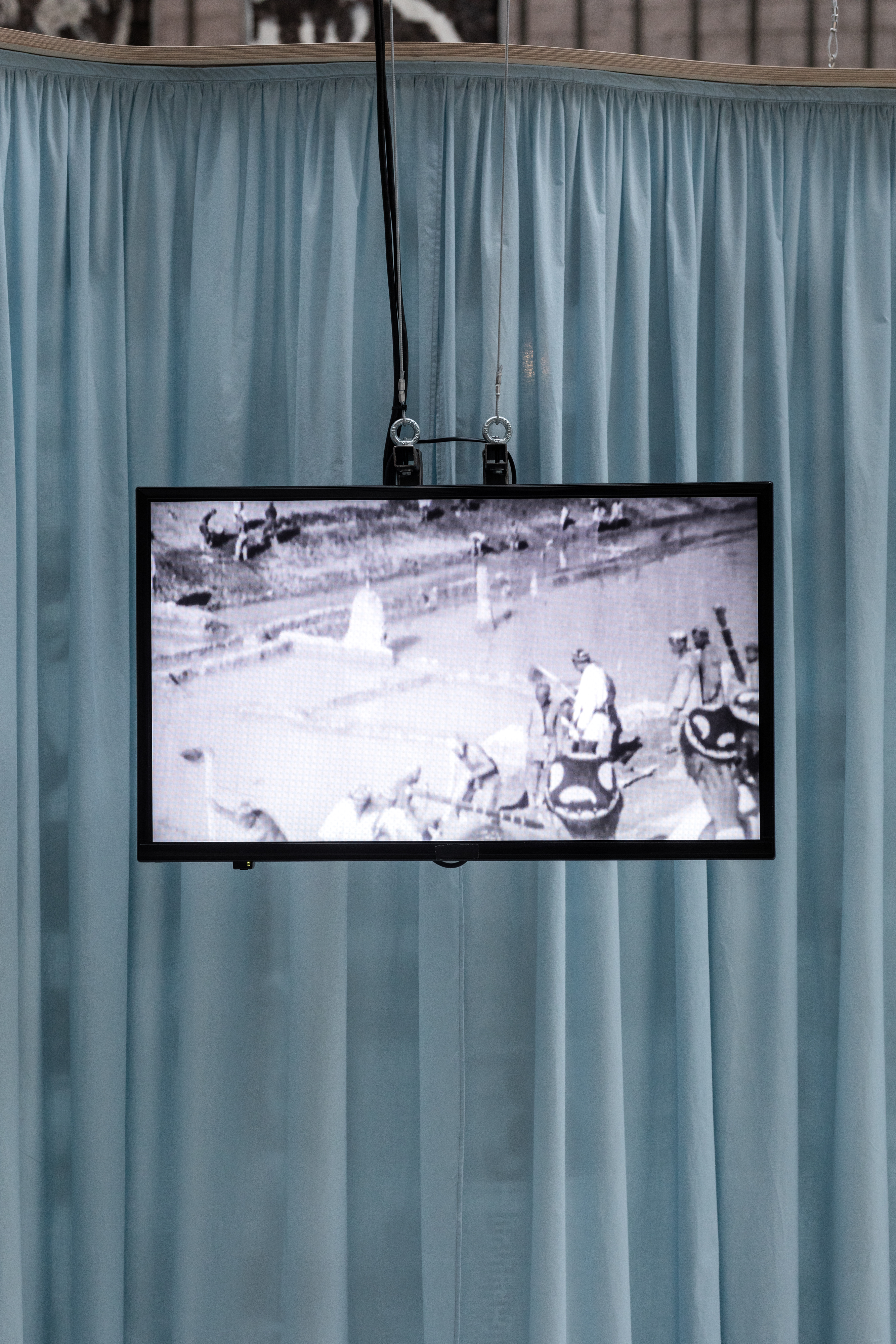 DAVRA (Central Asia, est. 2021) looks for historical connections between the use and misuse of women’s work and water. The artists study how women danced the Cotton Dance (Paxta Raqsi) to motivate the men working on the construction of the canal, blurring the line between leisure and labor. They present their findings in different forms: films, photos, textile collages, and archival material. The installation's shape mirrors the shape of the Syr Darya River. Carefully re-edited film chronicles tell the story of how women and water were misused for industrial ends in cotton production. DAVRA creates new portraits of the changing rivers in the Tashkent region and along the Fergana Valley. They transform cotton pickers’ aprons into sensitive collages to re-imagine relations between water, women, dance and cotton.