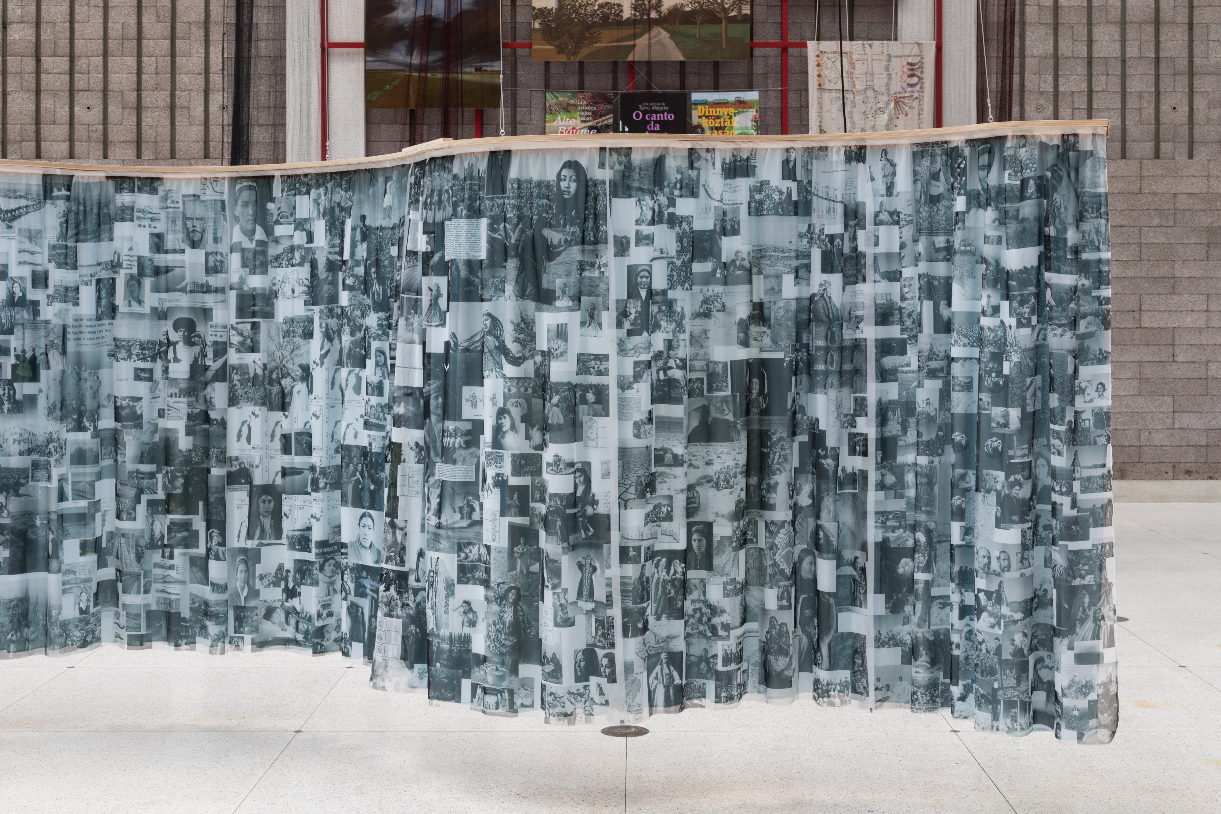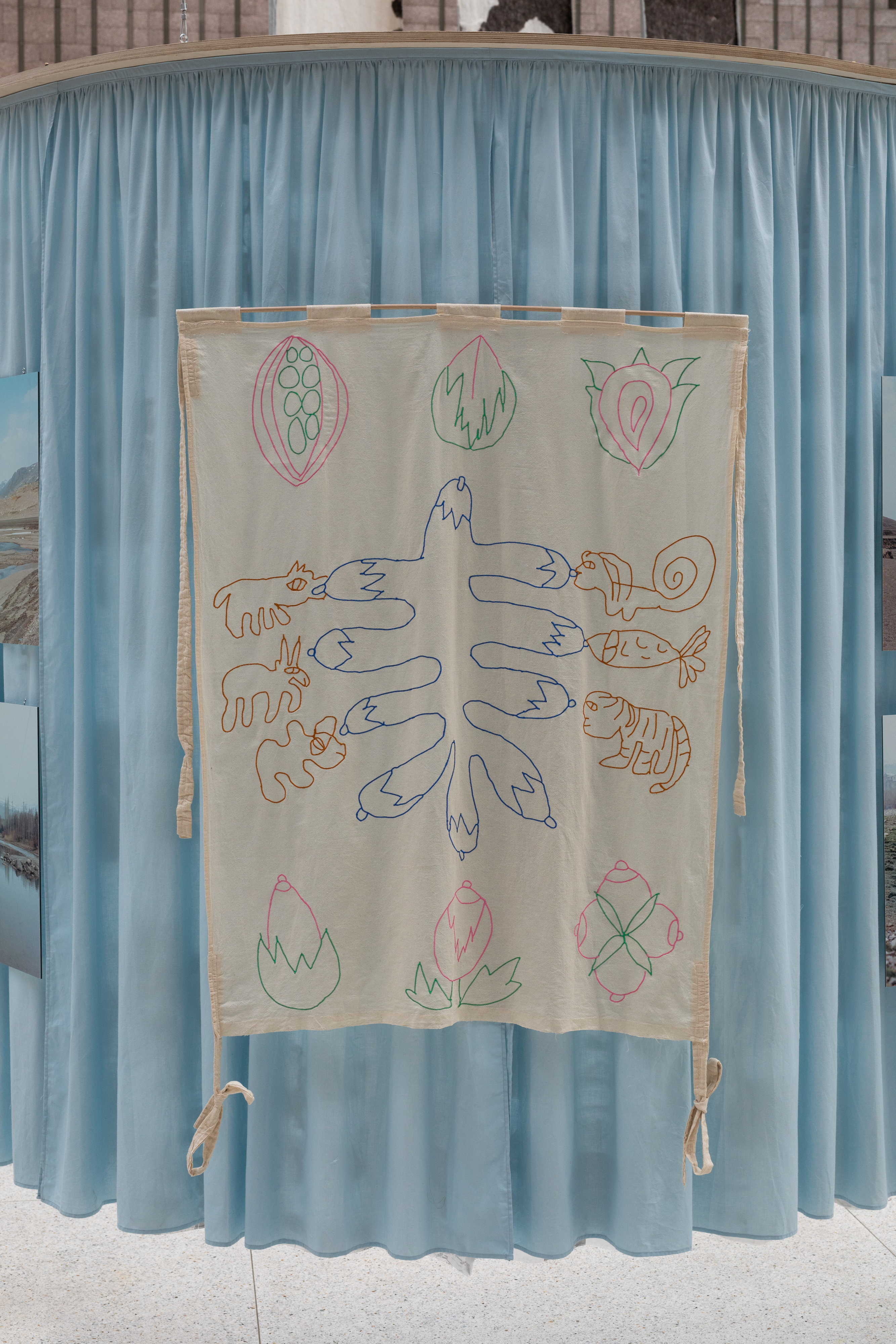 Taming Women and Waters in Soviet Central Asia / 2024 / research-based multimedia installation / archival films (8 min), archival work (collage, print on fabric, 200 × 700 cm), photography series (each print 60 × 48 cm), textile works (embroidery, each 94 × 119 cm) / courtesy of the artists
