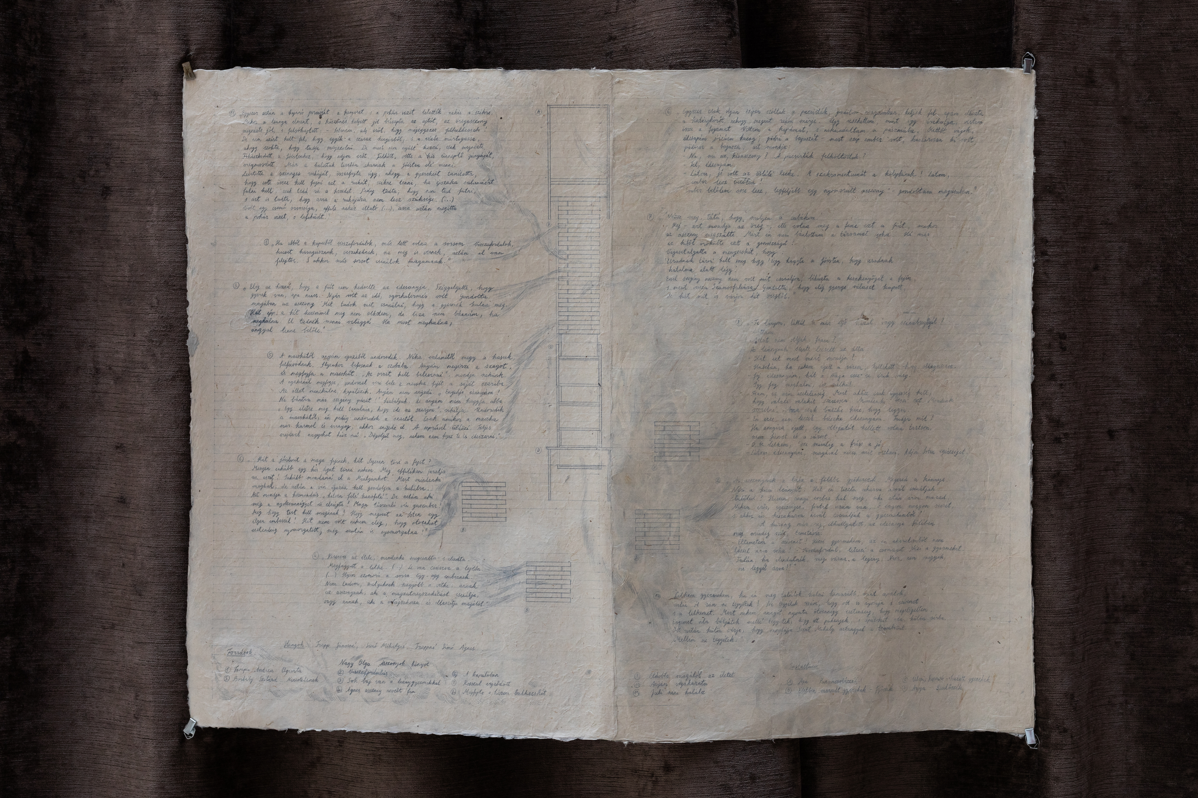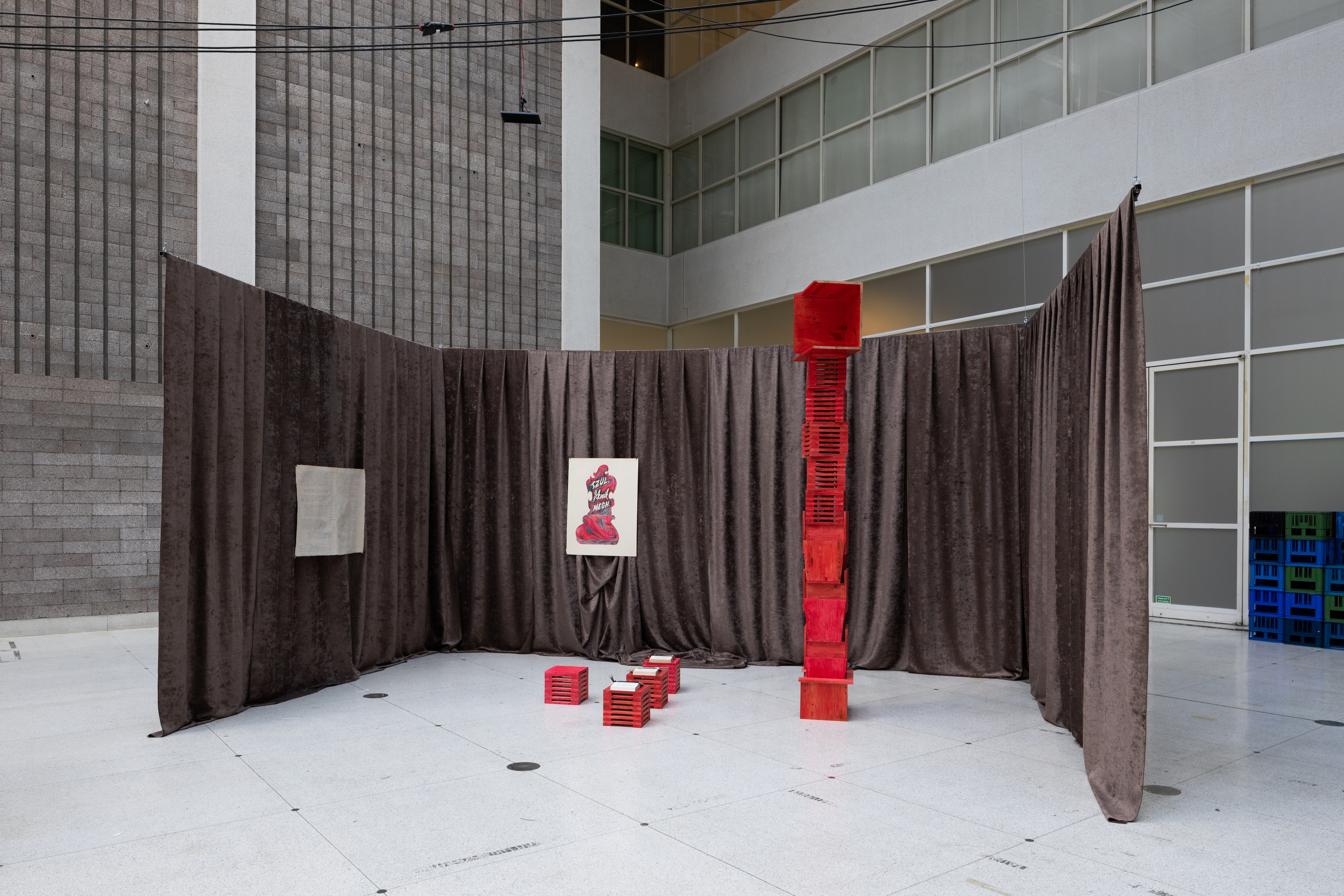 “Lay Him Not Upon Me...” – The Body of a Peasant Woman / 2020 / multimedia installation / audio (8 min 47 s), sculpture, painting (watercolor crayon, paper, 75 x 100 cm), drawing (watercolor pencil, paper, 70 x 85 cm), book, curtain / sculpture designed in collaboration with AU Workshop and Creature Furniture / courtesy of the artist and Horváth Művészeti Alapítvány