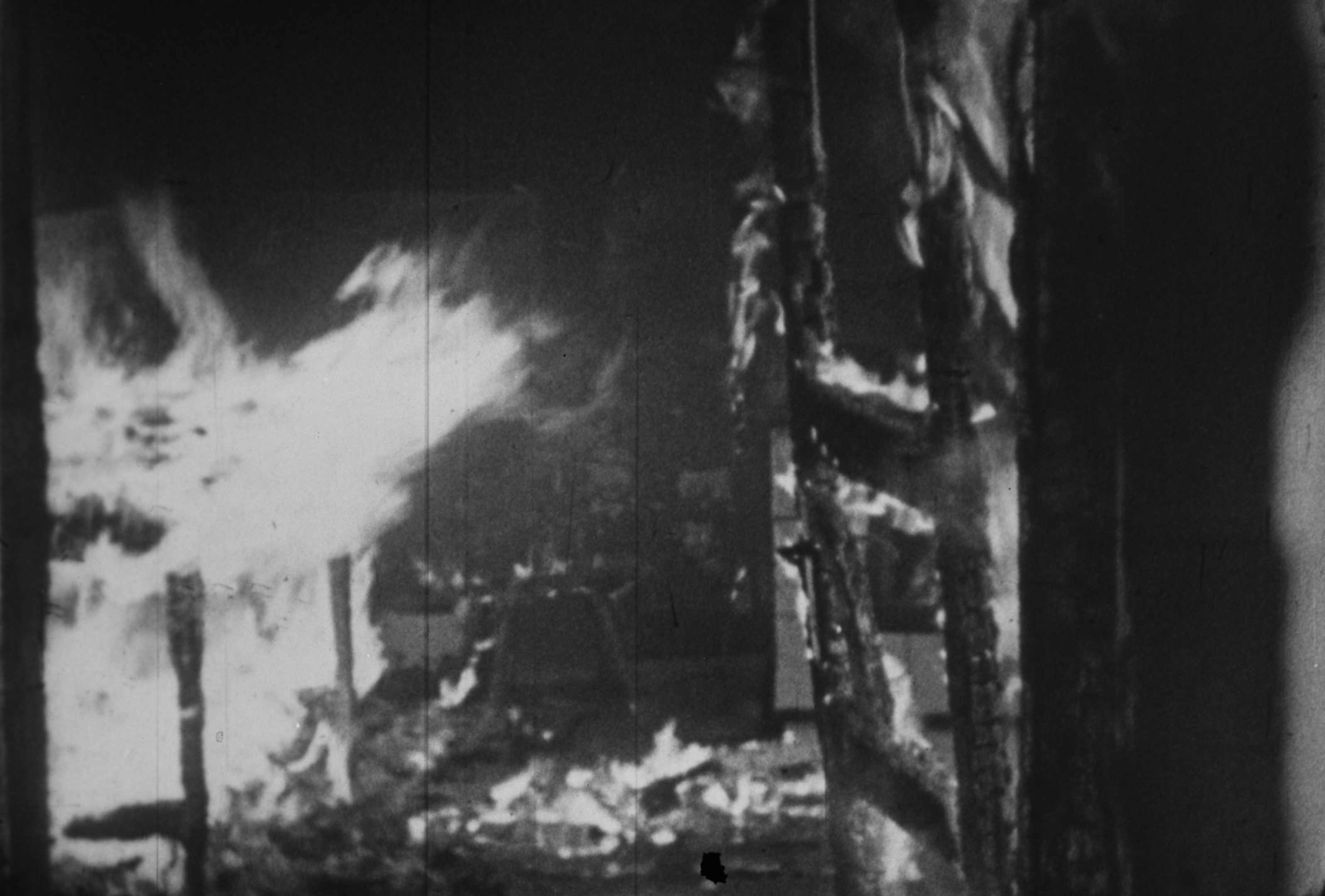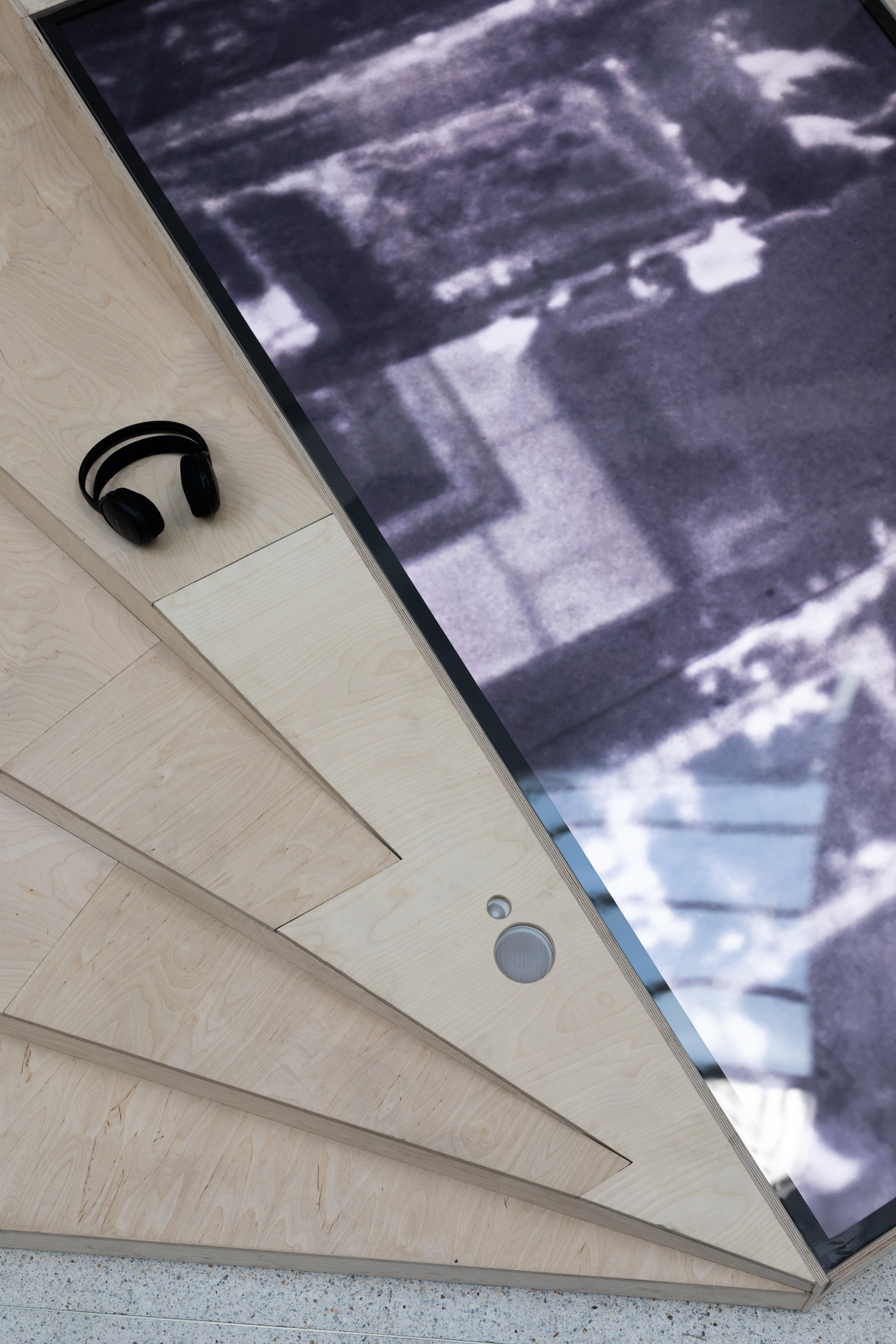 What Lies Above Us in The Shadows Like a Black Cloud / 2024 / video sculpture (8 × 8 m) / 4K, color/ B&W, stereo sound (23 min loop), wood / editing: Jelena Maksimović / cinematography: Staša Bukumirović / sound design: Vladimir Živković / research assistant: Eva Slabá / camera assistant: Michaela Sidorová / translation: Ashley Davis / archival footage: ZF 0369 LIDICE, source: Národní filmový archiv, Prague / thanks: Katalin Erdődi, Kristina Tělupilová, Vojtěch Kyncl, Bohumil Melichar, Michal Simunek, Miloslav Vorlíček, Rike Frank, Christine A. Maier, İz Öztat, Matěj Strnad, Clarissa Thieme, Nela Pietrová / courtesy of the artist
