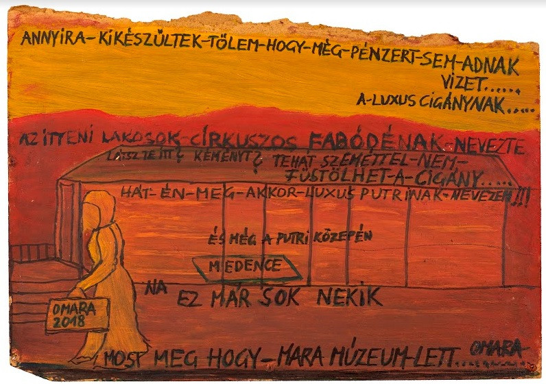 OMARA – Mara Oláh (1945–2020) začala malovat ve 43 letech, po smrti své matky. Souběžně s autobiografií malbou vyjadřovala v chronologickém pořadí hlavní traumata svého života, přičemž umění používala jako terapeutický nástroj, aby se vyrovnala s ponížením a překonala jej, zármutek ze ztráty matky, úzkost z odcizení od dcery a fyzickou bolest způsobenou rakovinou. Od roku 1992 jsou všechny její obrazy doplněny nápisy. Modré obrazy – namalované v různých tónech modré barvy a doplněné textovými vysvětlivkami a moudrými slovy – jsou zpovědí o autorčiných nejdůležitějších osobních zážitcích, o jejím vztahu s dcerou, o jejích těžkých zkouškách jako ženy a Romky. V roce 1993 otevřela ve svém domě v Kispestu vůbec první soukromou galerii umění v Maďarsku a v roce 1997 vydala vlastním nákladem autobiografii OMara festőművész [Malířka Omara].
