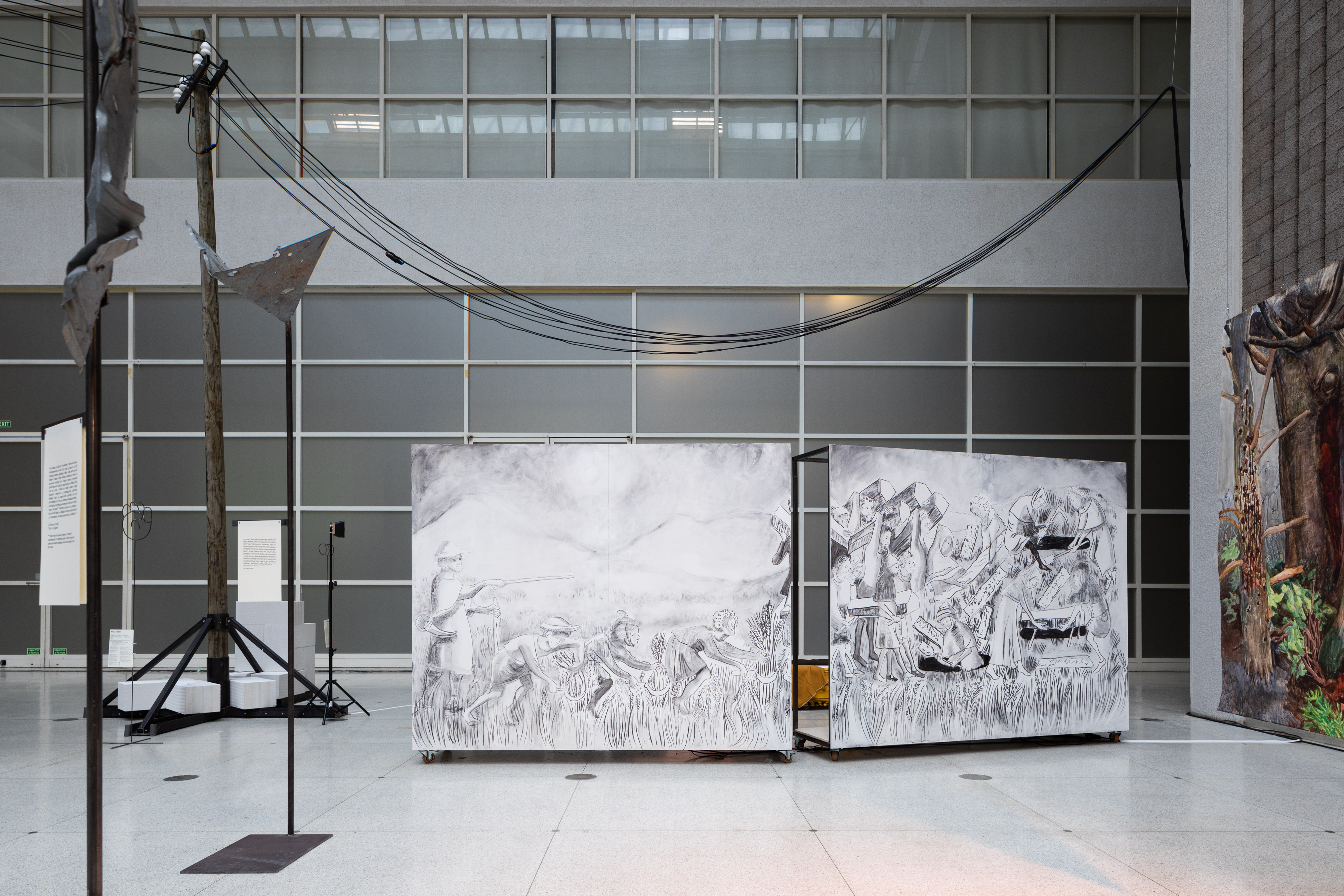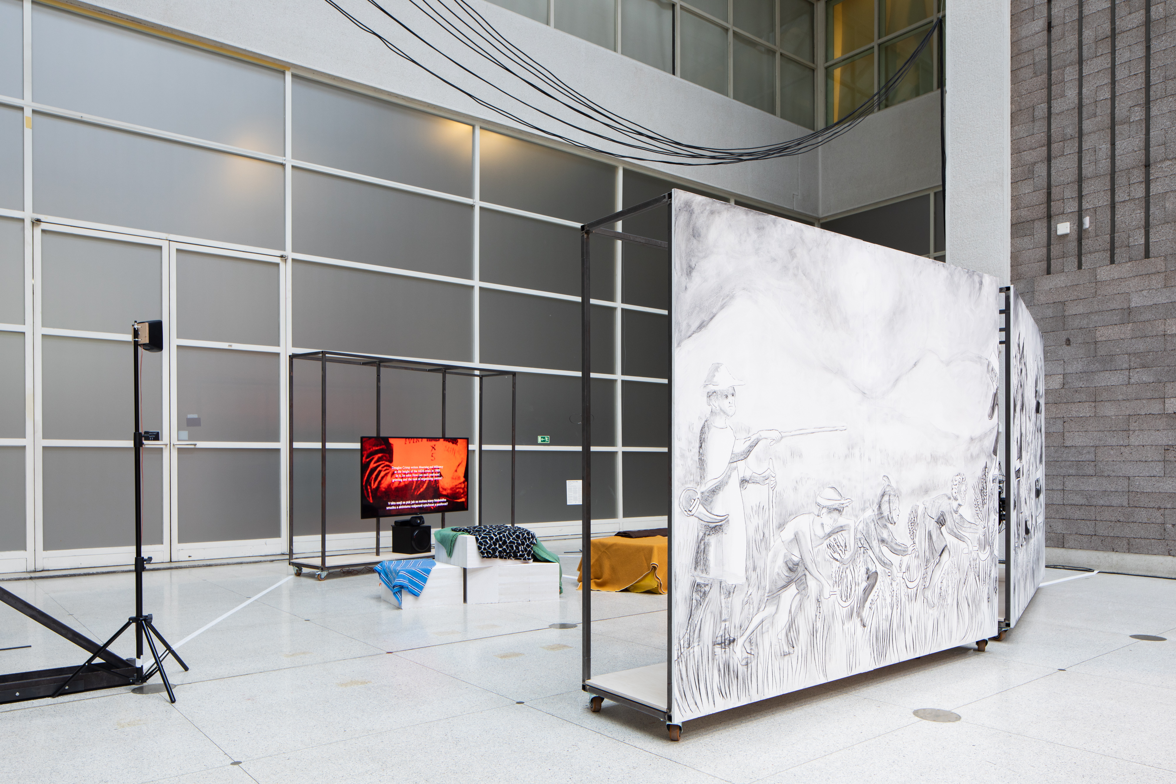 Tyto podmínky / 2022–2023 / tříkanálová video instalace / HD video, 5.1 audio (35 min 56 s) / podpůrné struktury / kresba / uhel, akryl / sezení (různé rozměry) / s laskavým svolením umělkyně / projekt podpořilo Ústřední ředitelství pro současnou tvořivost italského Ministerstva kultury v rámci programu Italské rady (2021), Vera List Center for Art and Politics v New Yorku a Foundation for Contemporary Arts Emergancy Grant