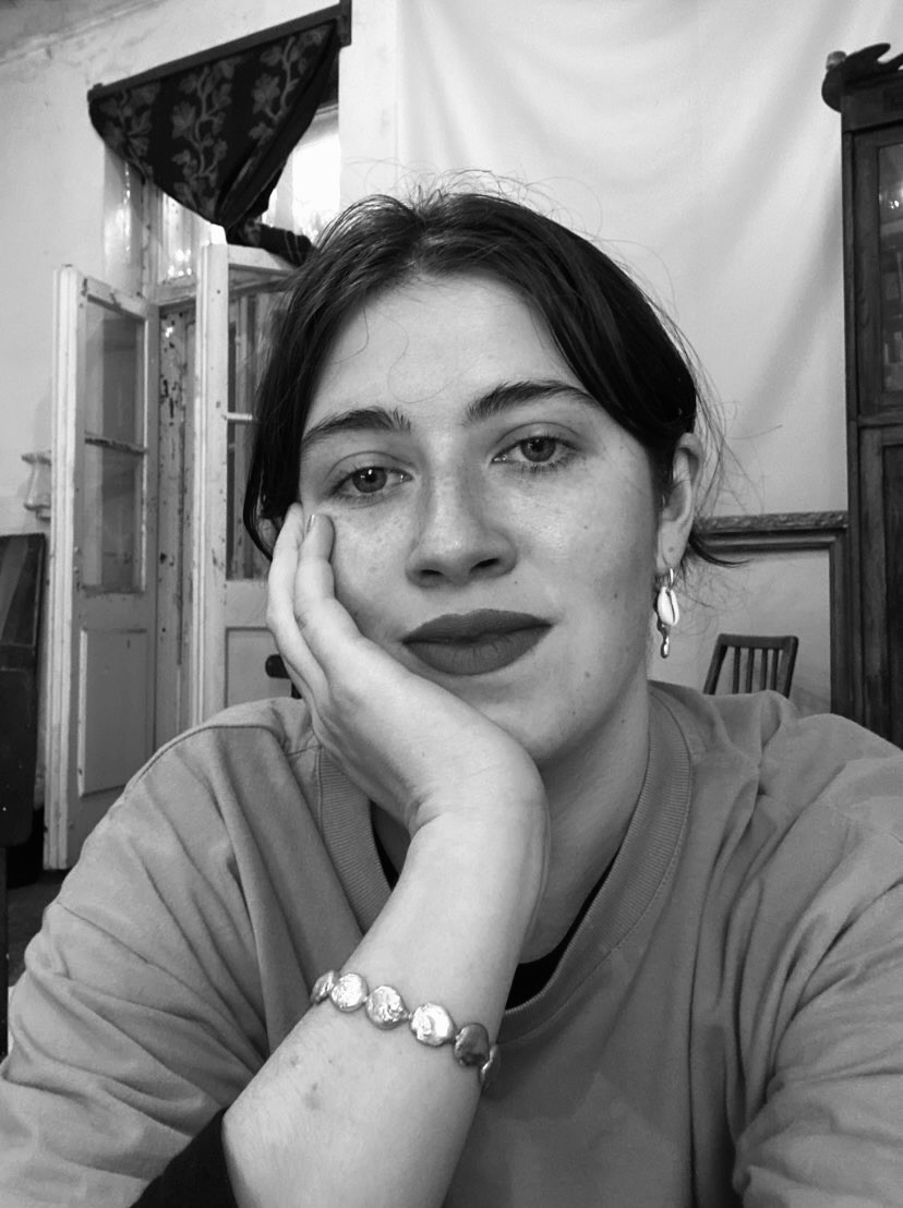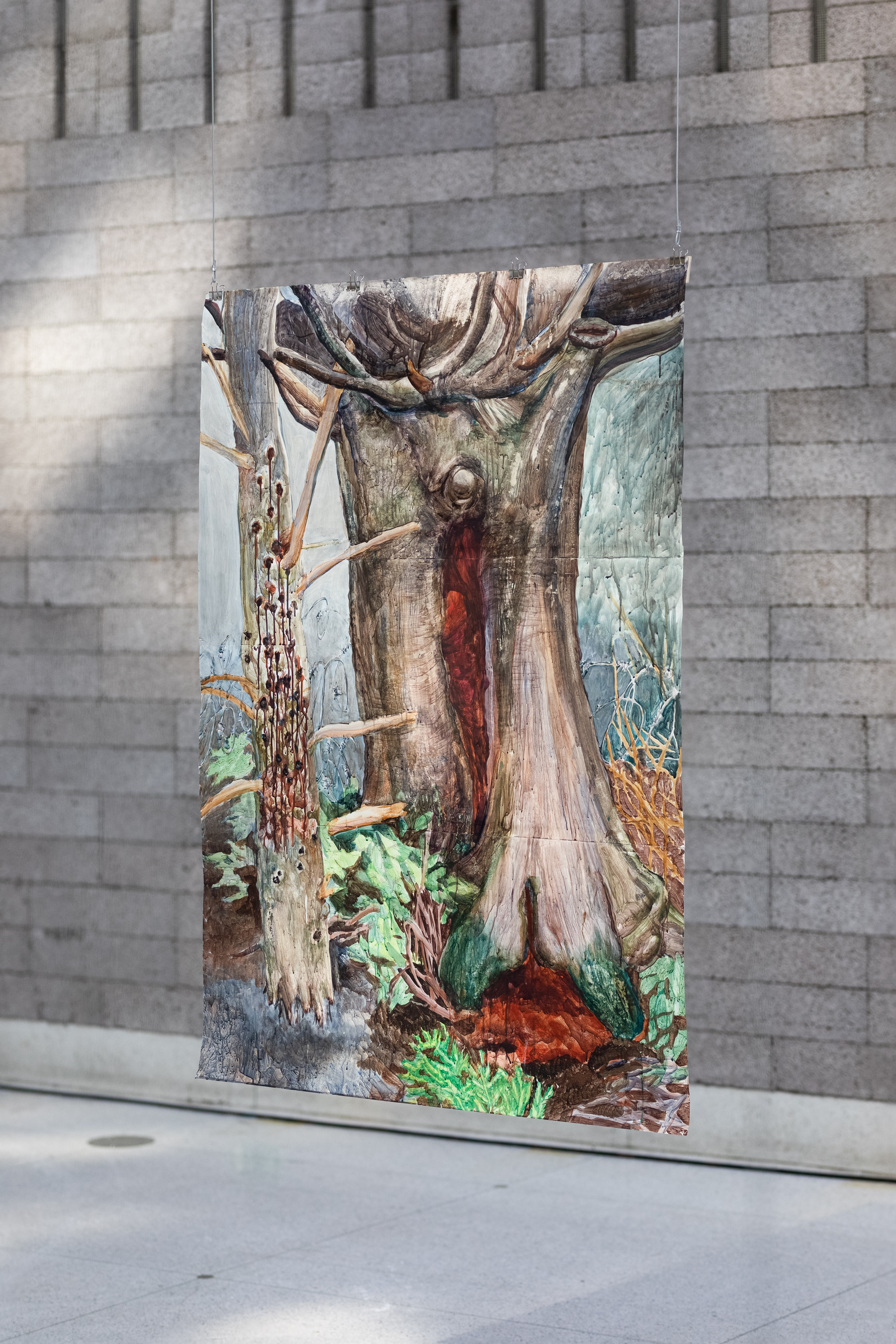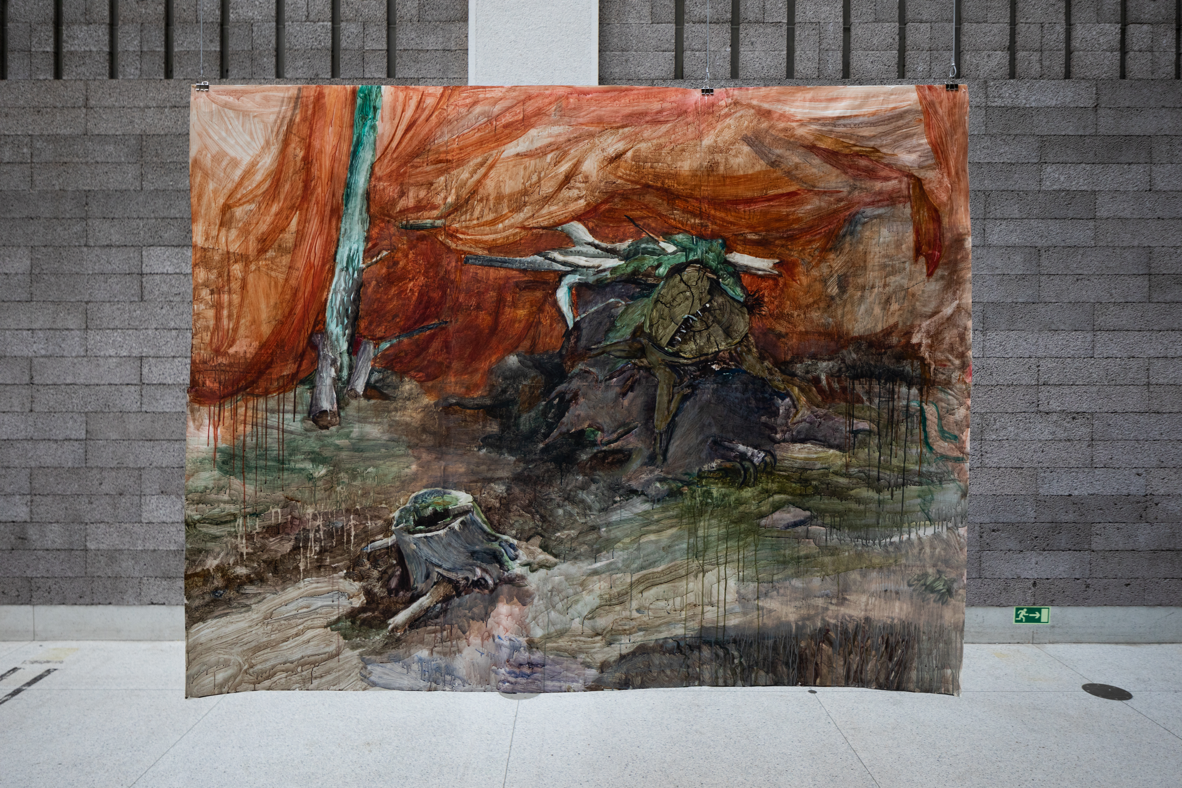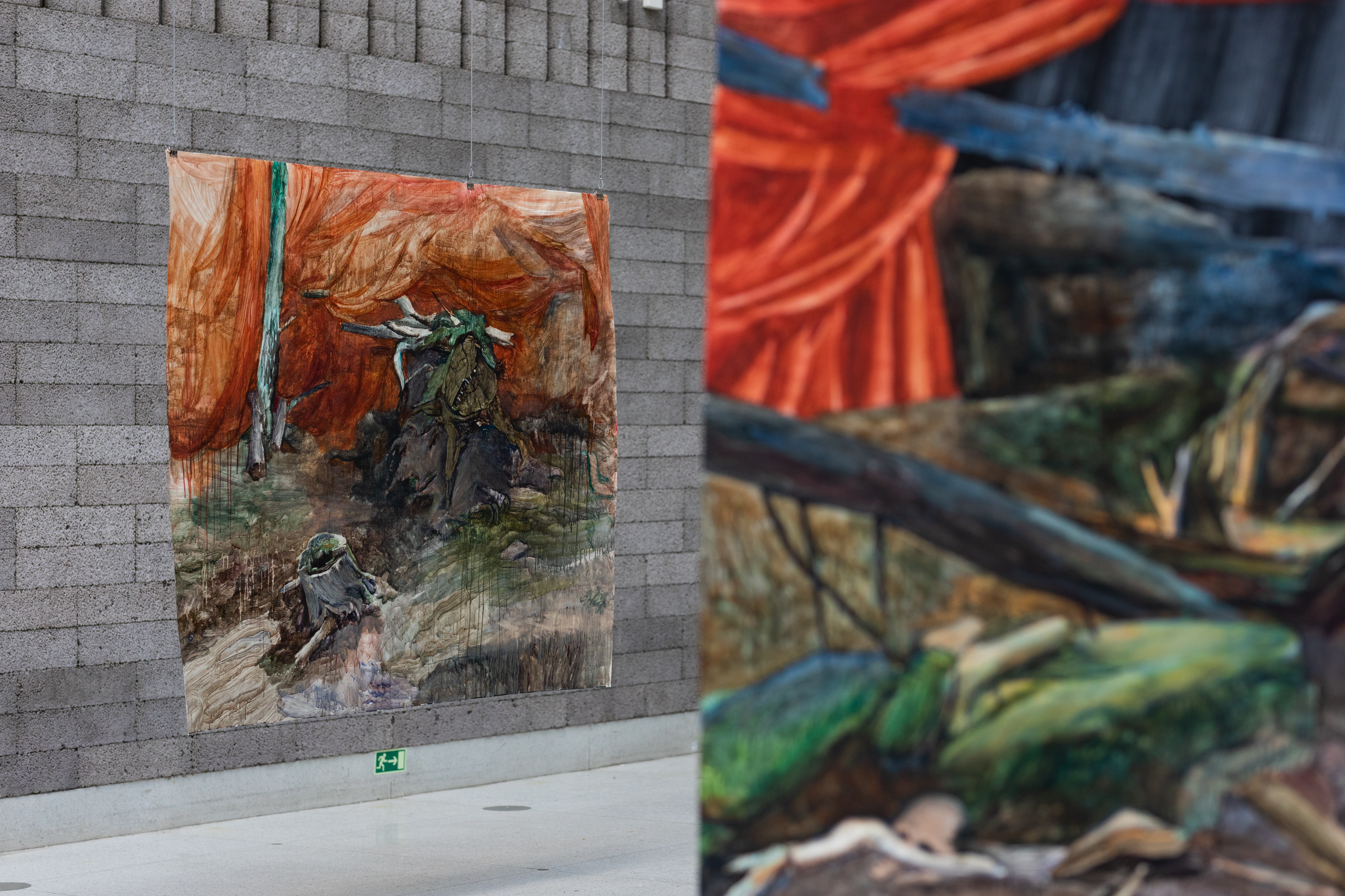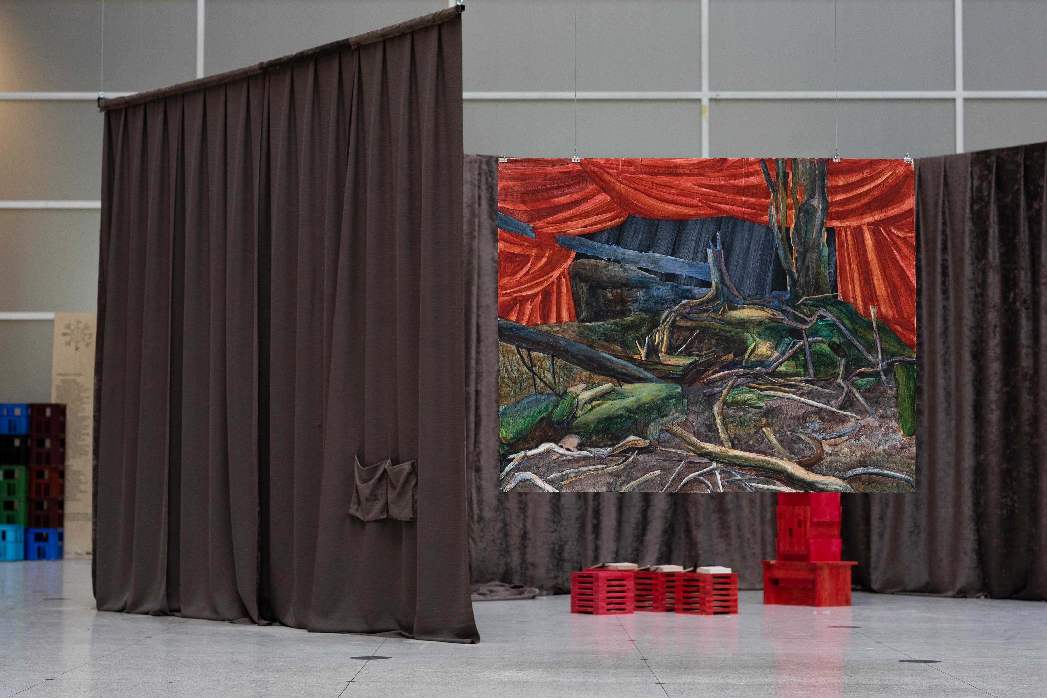 Kateryna Aliinyk (žije v Kyjevě, n. Luhansk (UA), 1998) tvoří malby a texty o trvající ruské invazi ve venkovských oblastech ukrajinského Donbasu od roku 2014. Zaměřuje se na změny krajiny. Co se stane se zemí, když lidé odejdou a nikdo už o ni nepečuje? Jak se škodlivé vlivy války projevují v půdě? Jakou formu obnovy si můžeme po takové zkáze představit? Zapustí ruční granáty kořeny jako mrkev nebo tuřín? Jak je možné vytvořit obrazy krajiny, kterou už nemůžete navštívit ani se jí dotknout? „V zemědělských oblastech se nacházejí nášlapné miny, úlomky raket a lidské ostatky vedle plodin,“ líčí umělkyně. „Tato kombinace nám připomíná, že každé bitevní pole je v první řadě pole. Ukrajinské obyvatelstvo dělá, co je v jeho silách, aby se půda navzdory všemu dál využívala ke svému původnímu účelu. Všichni si ale děláme starosti, jestli takovou úrodu můžeme sníst. Nebo jsme jen ztratili chuť k jídlu? Jsou stopy v hlíně otiskem zemědělských strojů, nebo vojenských vozidel?“ Kateryna Aliinyk neukazuje krajinu ze vzdálené ptačí perspektivy. Naopak zabírá detaily kořenů, rostlin, hlíny a válečných trosek. Její malby nám umožňují přiblížit se, možná i blíž, než bychom si přáli. Díla vystavená na bienále Ve věci umění obsahují nový prvek. Detailní záběry přírodních prostředí rámují divadelní opony. Krajina se stává jevištěm, na němž se odehrávají scény destrukce. Co to znamená být svědkem nekončící války—války nejen proti lidem, ale také proti životnímu prostředí?