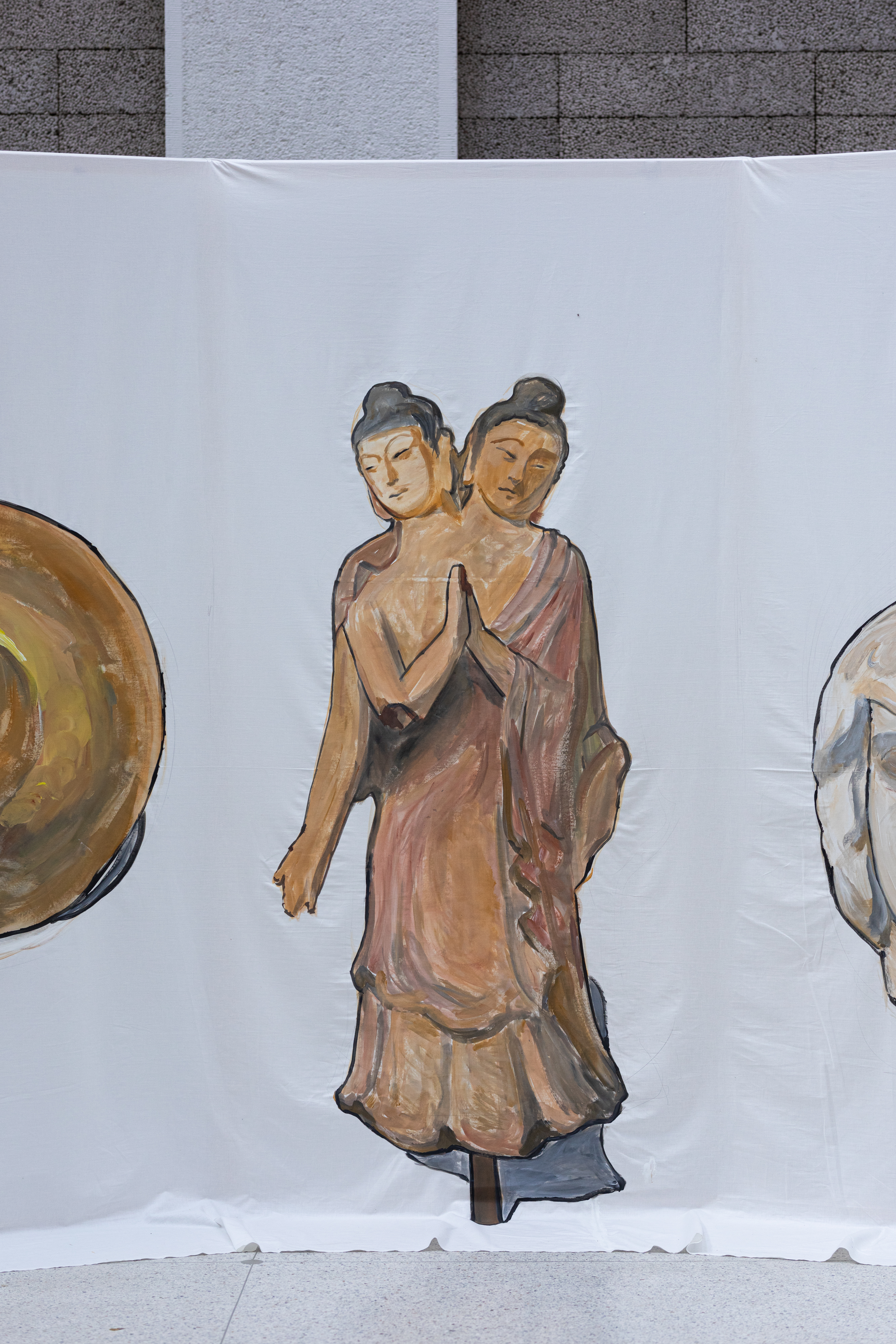 Malby Kateryny Lysovenko (žije v Kyjevě, n. Kyjev (Ukrajina), 1989) jsou světlé a někdy znepokojivé. Zobrazuje na nich krajiny, které připomínají otevřené rány, bájná stvoření chránící svůj prostor, děti či postavy s mužskými i ženskými rysy, které odpočívají a čtou si v úkrytu. Kateryna maluje i válečné a brutální scény. Poukazuje tak na historii lidského násilí, zrad a obětí. Současně mnohé z jejích děl poskytují divákům bezpečný prostor, mohou nás něco naučit, mohou nám pomoci, můžeme v nich nalézt útěchu. Hranice mezi mírem a válkou je velice křehká. Na Kateryniných malbách získávají svůj vlastní život nejen lidé, ale i předměty – promlouvají, cestují, zabíjejí či chrání. V nové instalaci spolu mluví předměty z muzea Ermitáž v ruském Petrohradu. Tyto předměty pocházejí z různých kultur různých dob, jež se ocitly pod koloniální nadvládou ruské říše. Někdo je ukradl nebo podvodně zakoupil. Skončily ve sbírkách daleko od míst svého původu. Během válek, i v případě dosud trvající ruské invaze na Ukrajinu, byly tisíce takových objektů ukradeny nebo zkrátka zničeny. Často dnes ani nejsou vystaveny, a pokud ano, stávají se symboly nadvlády. Muzea jsou pro tyto objekty vlastně vězením. Kateryna Lysovenko je maluje – nádobu z Kazachstánu, figurku z Dagestánu, nástroj z Ukrajiny – a tak se ocitají vedle sebe. Klade je tváří v tvář k sobě navzájem i k návštěvníkům výstavy. O jaké příběhy se s nimi podělí? Chtějí se vrátit domů? Jak se mohou osvobodit?