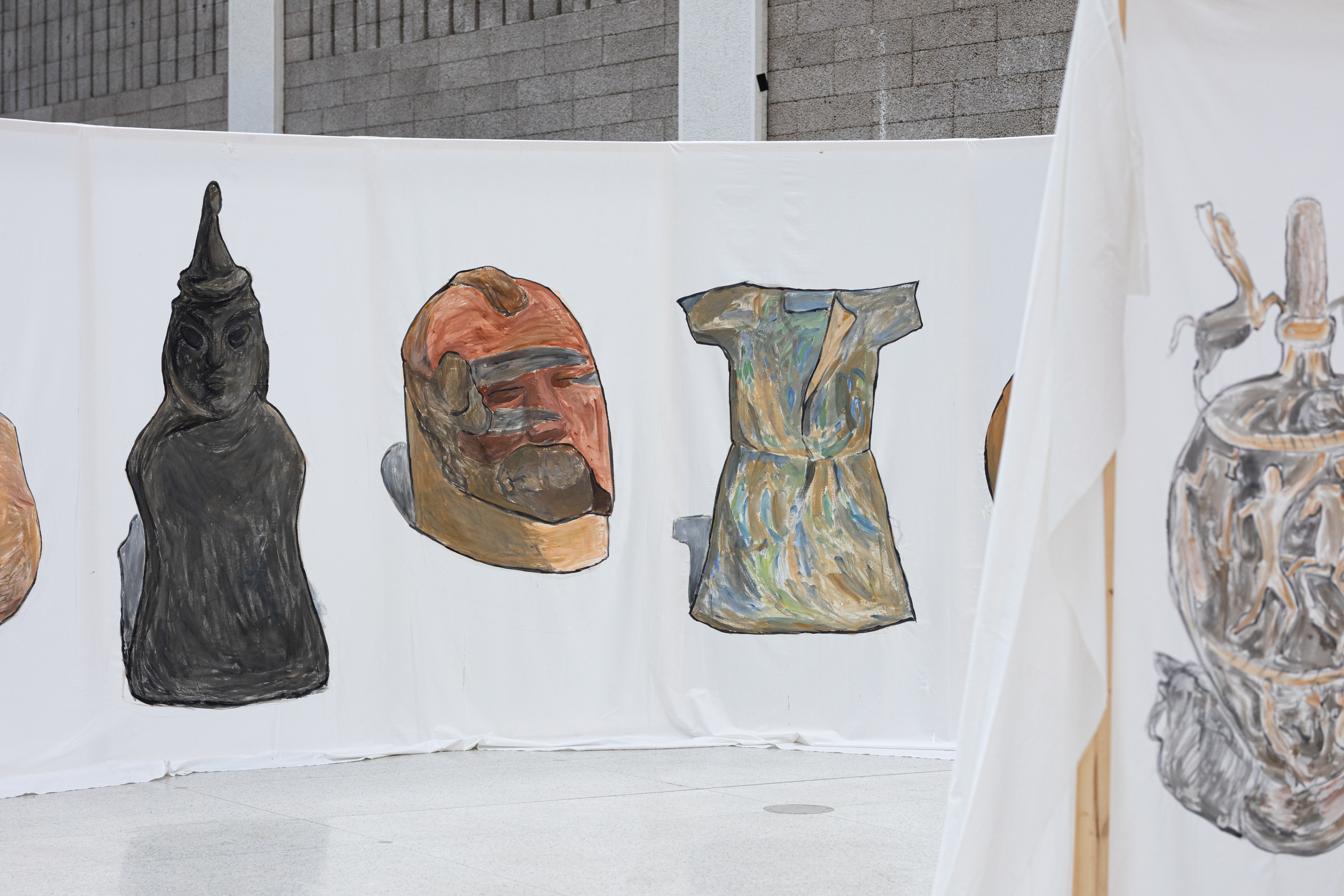 Noha bronzové trojnožky, 11.–12. století (místo nálezu: jižní Kazachstán, Taraz, přijato do sbírky: 1940, oddělení/sektor: Střední Asie, Kavkaz a Krym); džbán 3. století n. l. (místo nálezu: SSSR, oblast Brest, obec Trišin, přijato do sbírky: 1963, oddělení/sektor: Archeologie východní Evropy a Sibiře); nádoba s trubicovitým odtokem, 5.–3. století př. n. l. (místo nálezu: jižní Kazachstán, archeologické naleziště Berkkara); úlomek figurky, 2. tisíciletí n. l. (místo nálezu: Kavkaz, Dagestán, přijato do sbírky: 1924, oddělení/sektor: Střední Asie, Kavkaz a Krym); maska vytvořená na hlavě muže – cca 10 cm zelená hedvábná tkanina položená na obličej, n. l. (místo nálezu: Chakaská republika, archeologické naleziště Oglachty, přijato do sbírky: 1969, oddělení/sektor: Archeologie východní Evropy a Sibiře); kaftan pokrytý syrským hedvábím se símurgy, 9. století (místo nálezu: Kavkaz, Karačajsko-Čerkesko, přijato do sbírky: 1970, oddělení/sektor: Střední Asie, Kavkaz a Krym); zlatá naběračka s vyrytým zdobením, 8. století (místo vytvoření / škola: Zlatá Horda, archeologické naleziště Carevsko, oddělení/sektor: Střední Asie, Kavkaz a Krym); flakon (archeologické naleziště Chersonésos, přijato do Ermitáže: 1900, předal Říšský archeologický výbor); detail trůnu, 7. století př. n. l. (místo vytvoření / škola: Urartu, přijato do sbírky: 1885, oddělení/sektor: Starověký východ); polstrování pochvy meče, 7. století př. n. l. (místo nálezu: oblast Cherson, Jelizavetgrad, archeologické naleziště Kurgan – Melgunovský poklad, materiál/technika: zlato, kůže, mastix, plastic, rozměry: délka 43,3 cm, šířka 12,1 cm (max.), šířka 2,8 cm (min.), přijato do sbírky: 1763, oddělení/sektor: Archeologie východní Evropy a Sibiře); váza s reliéfem s mytologickými výjevy se dvěma uchy ve tvaru kentaurů, 2. polovina 4. století př. n. l. (místo nálezu: Moldavsko, Contesti, přijato do sbírky: 1841, oddělení/sektor: Archeologie východní Evropy a Sibiře) – v Ermitáži vyzývají k diskusi o tom, komu patří minulost. / 2023–2024 / instalace / s laskavým svolením umělkyně
