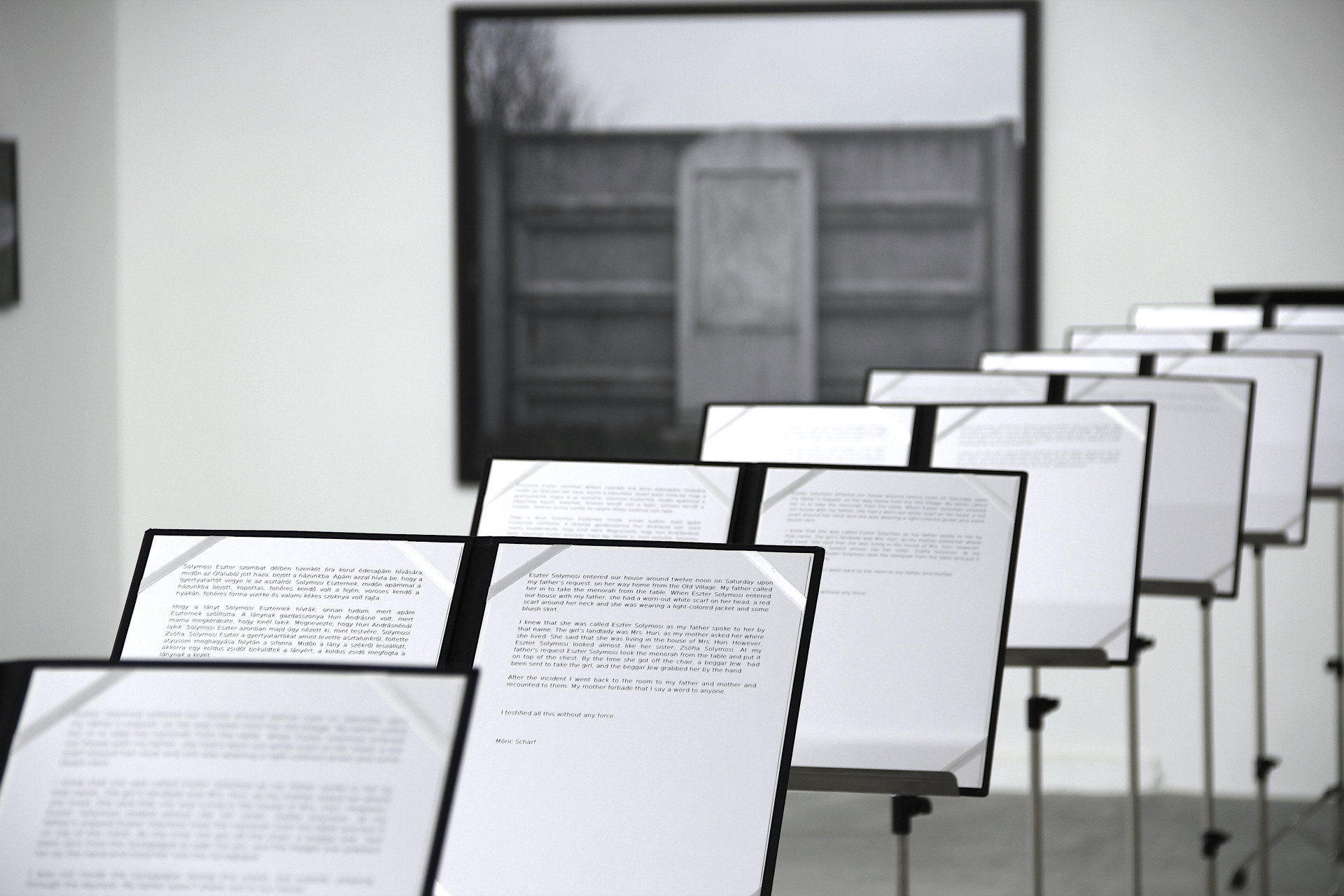 Hajnal Németh, False Testimony – Version 3, 2013, instalace partitur a série fotografií, 11 transkripcí, vytvořeno s podporou OSA – Open Society Archives, Galerie Ebensperger Berlin, 2017. Foto: archiv Hajnal Németh