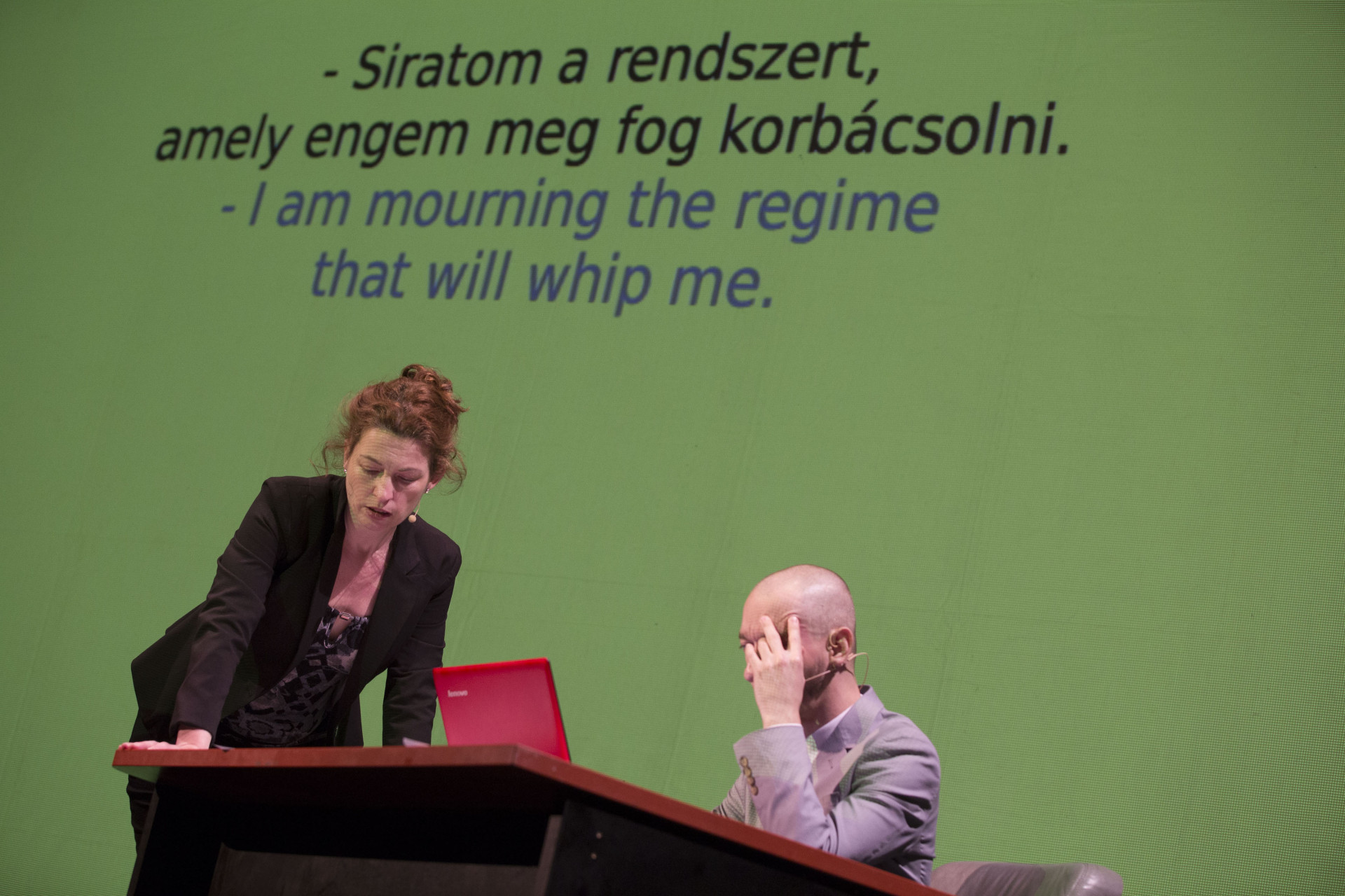 Hajnal Németh, The Loser (The Banker), 2015, experimentální opera, 40 minut, vystupují Andrea Csereklyei a Kornél Mikecz, divadlo Átrium Budapešť, vytvořeno s podporou OFF-Biennale Budapest. Foto: Zoltán Kerekes