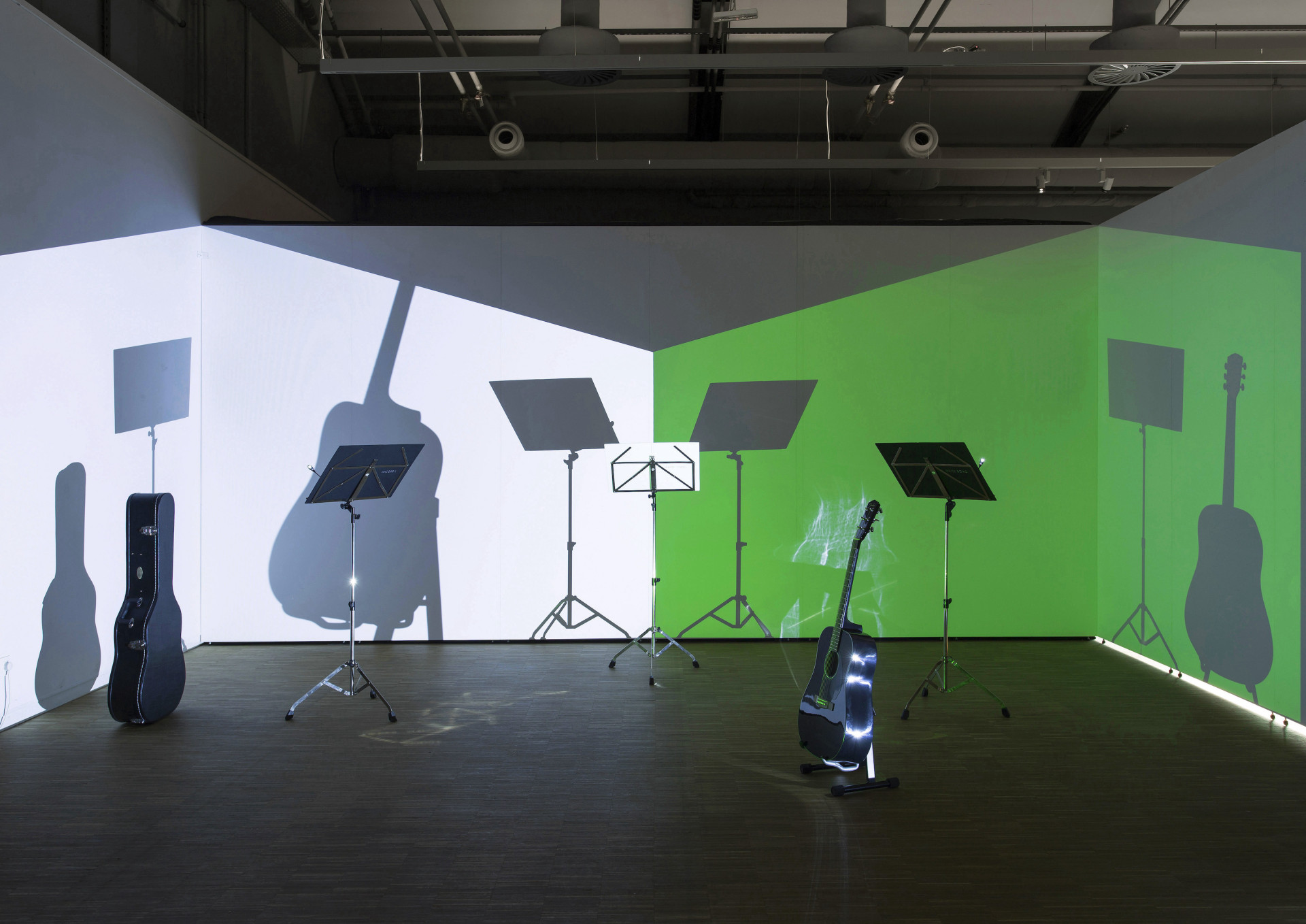 Hajnal Németh, White Song – Among Others, 2017, instalace, sborníky písňových textů a partitury na notových stojanech, akustická kytara, pouzdro na kytaru, barevná projekce. New Budapest Gallery, vytvořeno s podporou Leopold Bloom Art Award. Foto: Tamás G. Juhász