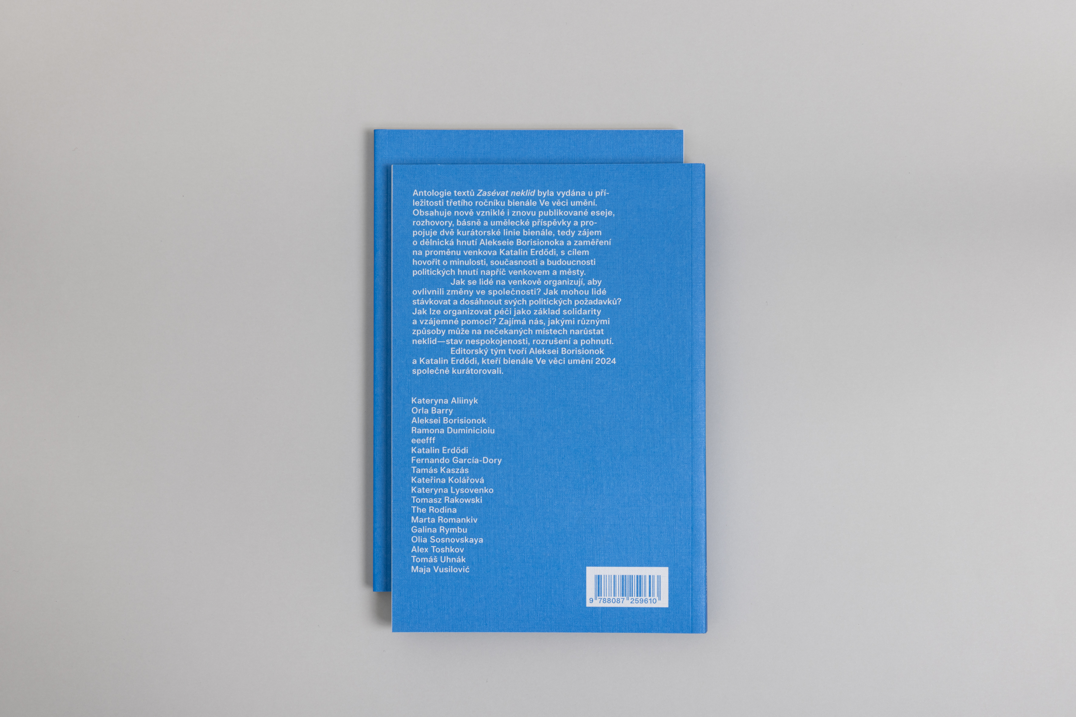 Zásevat neklid – antologie textů byla vydána u příležitosti třetího ročníku bienále Ve věci umění. Antologie obsahuje nově vzniklé i znovu publikované eseje, rozhovory, básně a umělecké příspěvky a propojuje dvě kurátorské linie bienále – zájem o dělnická hnutí Alekseie Borisionoka a zaměření na proměnu venkova Katalin Erdődi – s cílem hovořit o minulosti, současnosti a budoucnosti politických hnutí napříč venkovem a městy. Jak se lidé na venkově organizují, aby ovlivnili změny ve společnosti? Jak mohou lidé stávkovat a dosáhnout svých politických požadavků? Jak lze organizovat péči jako základ solidarity a vzájemné pomoci? Zajímá nás, jakými různými způsoby může na nečekaných místech narůstat neklid - stav nespokojenosti, rozrušení a pohnutí.