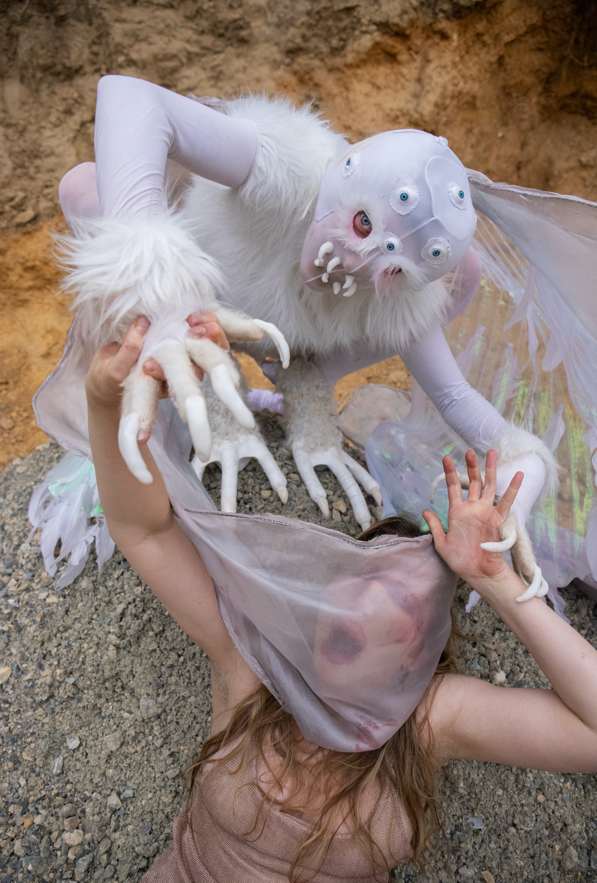 Miriama Kardošová a Tina Hrevušová v galeriích performují v surreálných a znepokojivých maskách, které jim pomáhají vystoupit z vlastní komfortní zóny. Berou s sebou i své publikum a skrze performance vycházející z jejich vlastních traumatických prožitků a selhání se společně vydávají na hranici bezpečné sebereflexe.