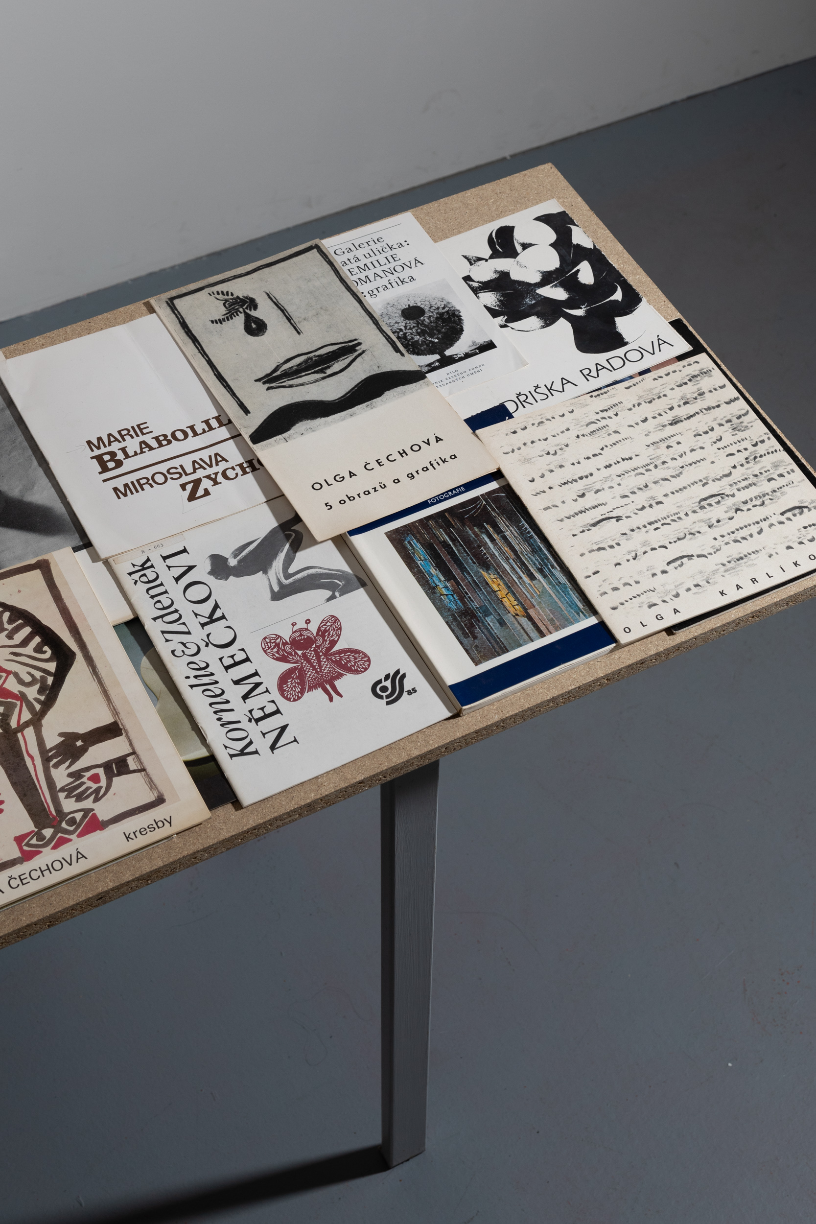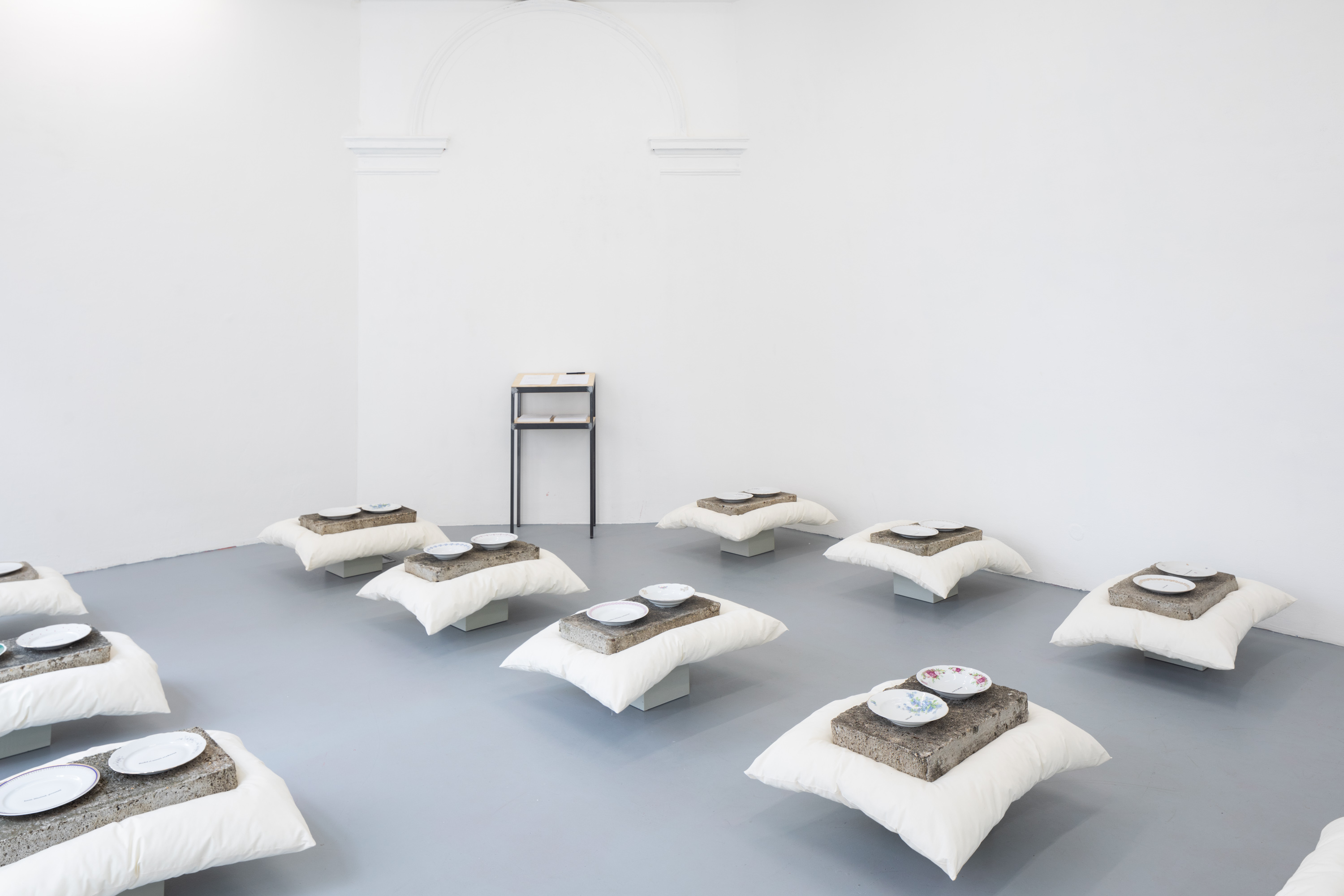 Instalace polštářů, betonových bloků a talířů s texty pak odkazuje k dlouhodobému zájmu o umělkyně, jejichž tvorba, ale i každodenní životní reálie jsou často zastřeny neúprosnou tíhou dějin. Můžeme nalézt umělkyně neviditelné, skryté, zastřené, ale i zapomenuté. Diváctvo se s touto rešerší může seznámit v druhé části výstavy, kde jsou ke studiu připraveny archivní katalogy a monografie. Nacházíme v nich dílo a život, které mají svou hodnotu i v odstínech viditelnosti, ke kterým je třeba se dopracovat osobní pozorností a zájmem.