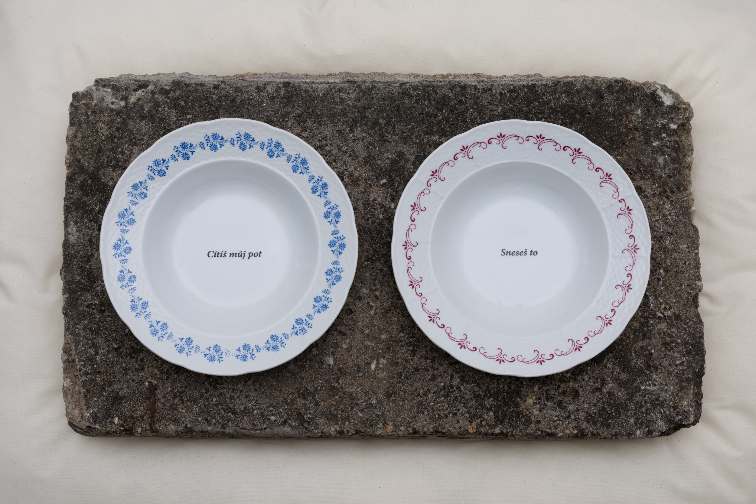Když si několik desítek minut prohlížíme staré katalogy nebo monografie a vidíme život a tvorbu, která se odvíjela po několik desetiletí, je to zvláštní pocit. I přes tíhu každodenního života poznamenaného péčí o rodinu tyto životy proběhly, tato díla vznikla, jsou někde tady, k nahlédnutí. Jsou vždy zapsaná v čase, i kdyby zastřená. Dojetí však může být poznamenané i určitou hořkostí příběhů, které si nikdo nevyslechne, a křivd, které se nenapraví. Důležitou součástí výstavy jsou texty na talířích. Je to právě reduktivní forma textů i výtvarného tvarosloví, která vymezuje Sráčovu poetiku. Přesnost a leckdy i jistá přísnost, často ale s humorem. Věty, jež najdete na talířích, jsou kurátorskou koláží textů Sráče Sama, které vybral a seřadil František Fekete. Jedná se vždy o diptych. Pod jejich na první pohled civilním obsahem skrytě bublají emoce. Každé dvojverší obsahuje náznak vztahové dynamiky či dialog (ač není jasné, jestli jde o skutečný dialog, či vnitřní monolog). Jde o protikladné sjednocení, můžeme si to představit jako jin a jang.