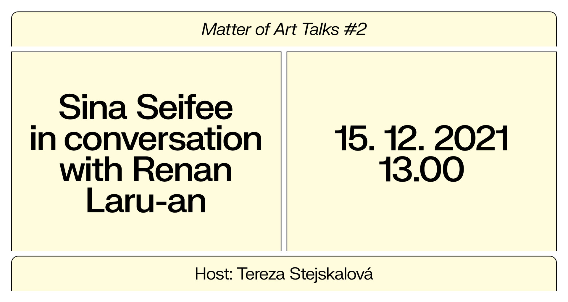 We invite you to the second episode of a series of live-streamed interviews with curators and artists hosted on the Biennale Matter of Art Instagram account. The debate will take place on Wednesday, December 15, 2021 at 1 pm (CEST). The artist Sina Seifee will discuss his current projects and artistic practice with the curator Renan Laru-an. The event is hosted by Tereza Stejskalová.