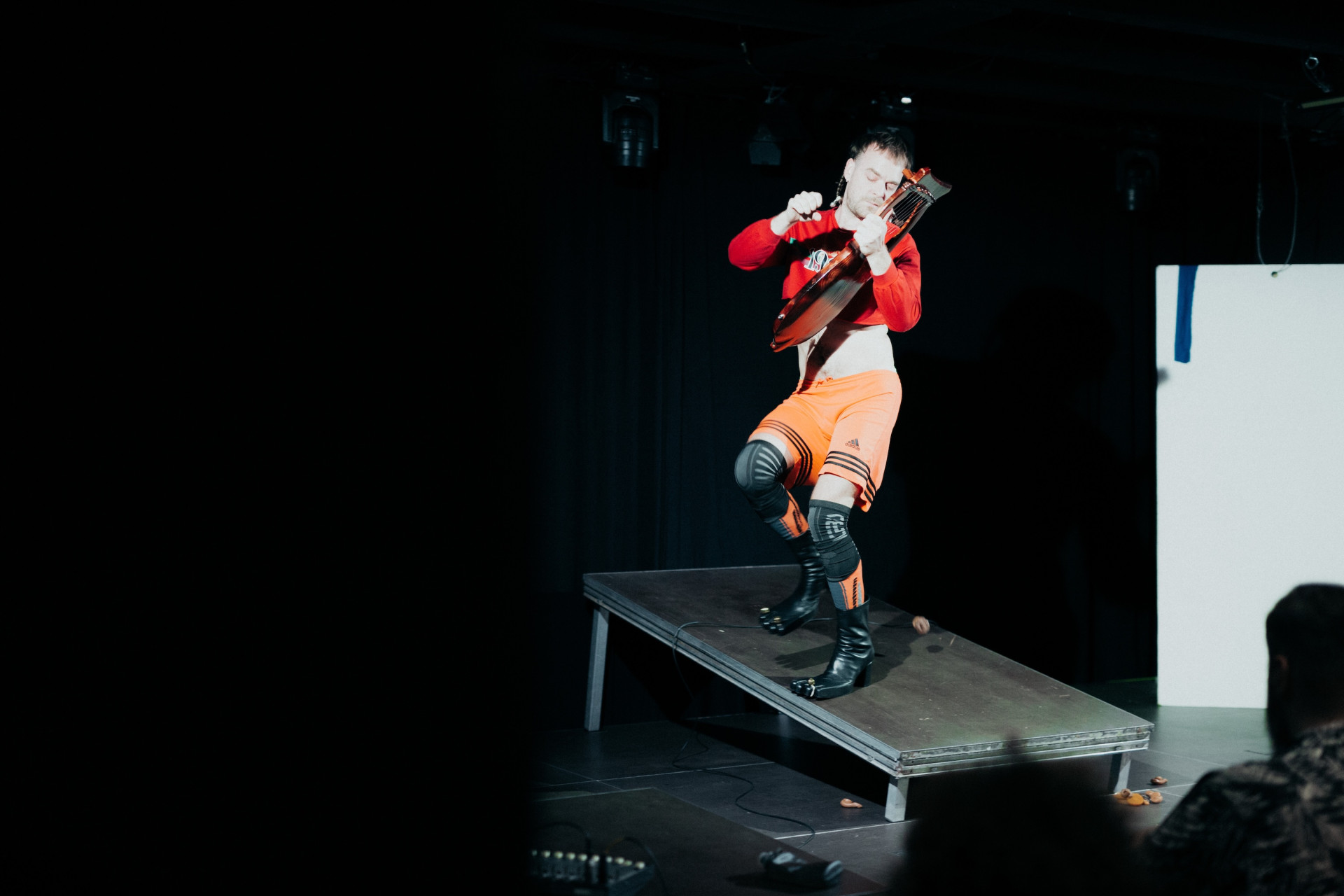 Aliza Orlan opens the festival with the installation and performance thorns grow out of my body. This intimate work, inspired by fairy-tale and pop-culture images of femininity, explores queer bodily experience and the transcending of gender boundaries. Dominik Styk presents the absurd dance burlesque Pissed Prophet. Through personifications of a bladder and a fish, he connects physiological body processes with their anthropological interpretations. Skjold Rambow & CTM create a dialogue between contemporary dance and cello in their project Bow, focusing on subtle shifts in posture and behavior. Miriama Kardošová, as Victoria Oren, premieres the performance “Shake my hair over the dirt we sweat off.” She confronts patriarchal expectations and stereotypes through living, hysterical euphoria. Alex Franz Zehetbauer presents the Czech premiere of his queer stand-up show “sixsixsix.” In the role of a jester, he embodies repressed and uncontrollable aspects of corporeality. eva susova & Publik Universal Frxnd close the festival with a “queer assemblage.” They combine breath, laughter, spoken word, and cello to explore the relationship between embodied knowledge and systems of power.
