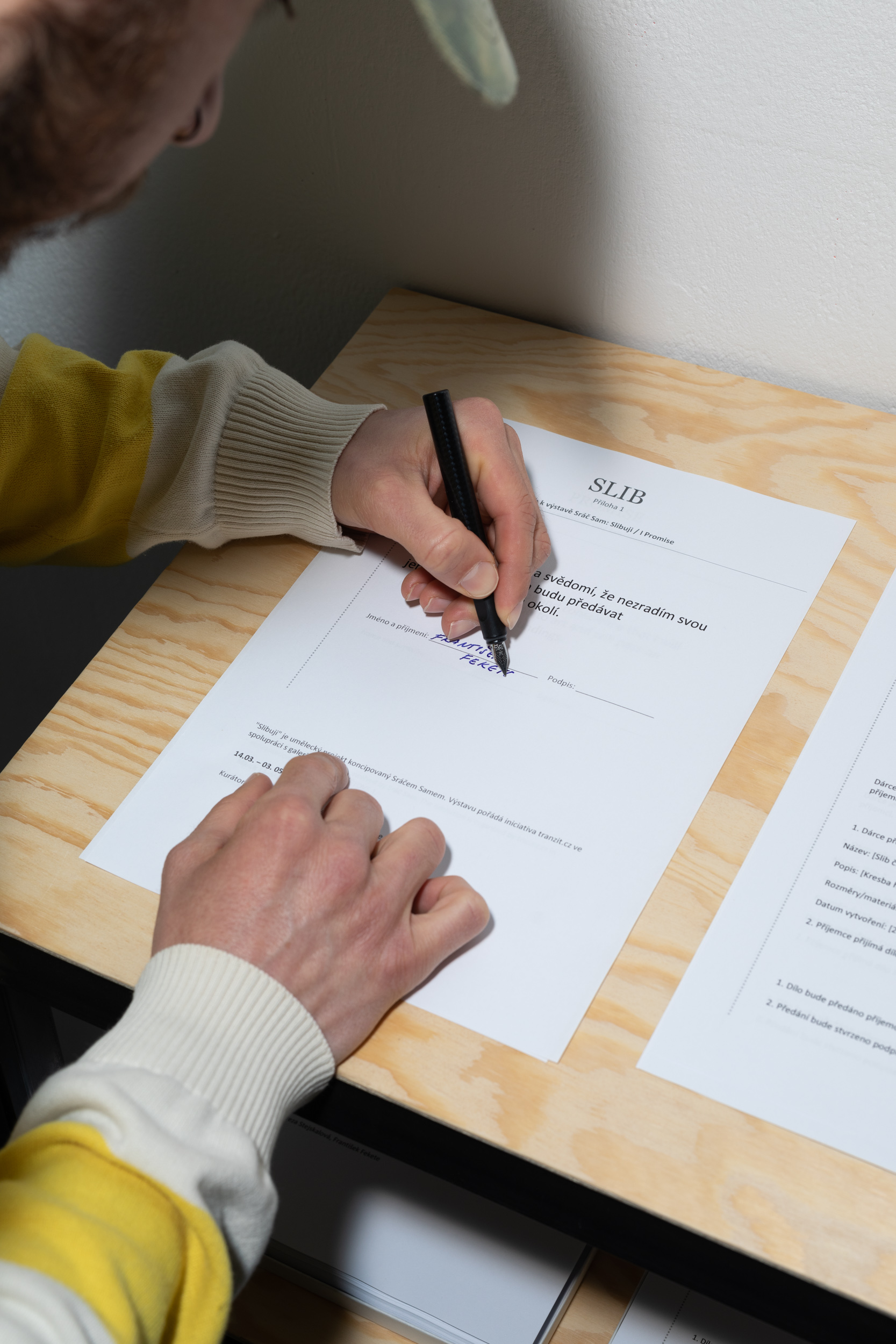 The second fundamental aspect of Sráč Sam’s work is the trust with which she approaches collaboration and the audience. In the present exhibition she invites visitors to promise to pay attention to art, in return for which they will receive an original work—a limited edition of one hundred pieces. The fulfillment of the pledge and its interpretation, however, are left up to the audience. But it’s not the same as receiving the work for free, for a promise inherently creates a form of trust, and we can understand it as a mutual investment whose value cannot be reduced to money. The relevance of the commitment we make lies precisely in the acceptance of a personal responsibility toward art, whose parameters we set ourselves according to our own conscience.