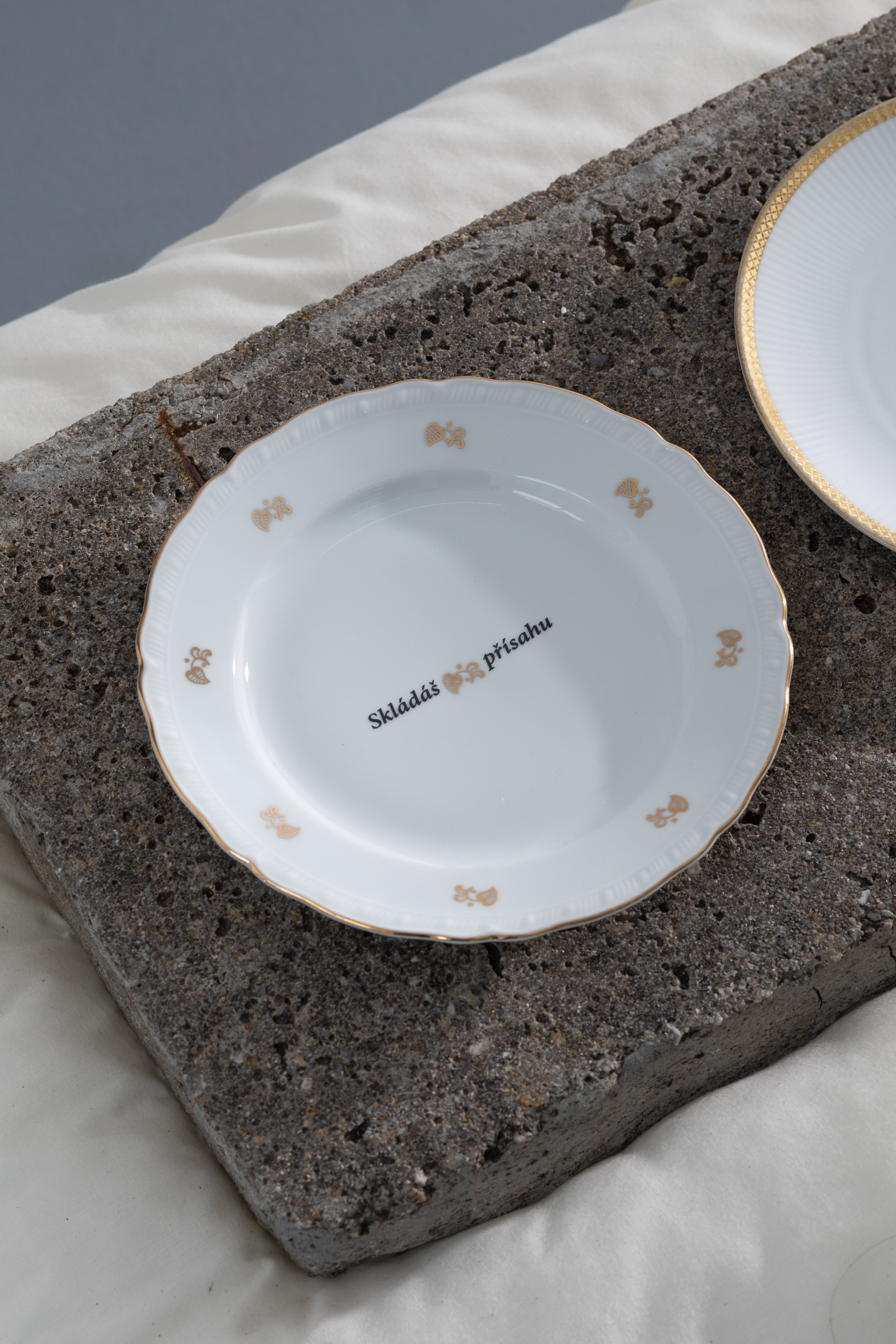The texts on the plates are an important part of the exhibition. Their reduced and incisive form is combined with the limitlessness of the poetics, whose interpretation is entrusted to the audience. It is the reductive form of the texts as well as their visual morphology that define Sráč Sam’s poetics—precision and at times a certain severity, but often with humor. The sentences found on the plates are a curated collage of texts by Sráč Sam, selected and arranged by František Fekete. They are always diptychs. Beneath their seemingly civil contents hide bubbling emotions. Each couplet contains a hint of a relational dynamic or a dialogue (although it is not clear whether it is a dialogue between you and me or an inner monologue). It is a union of opposites; we can imagine it as yin and yang.